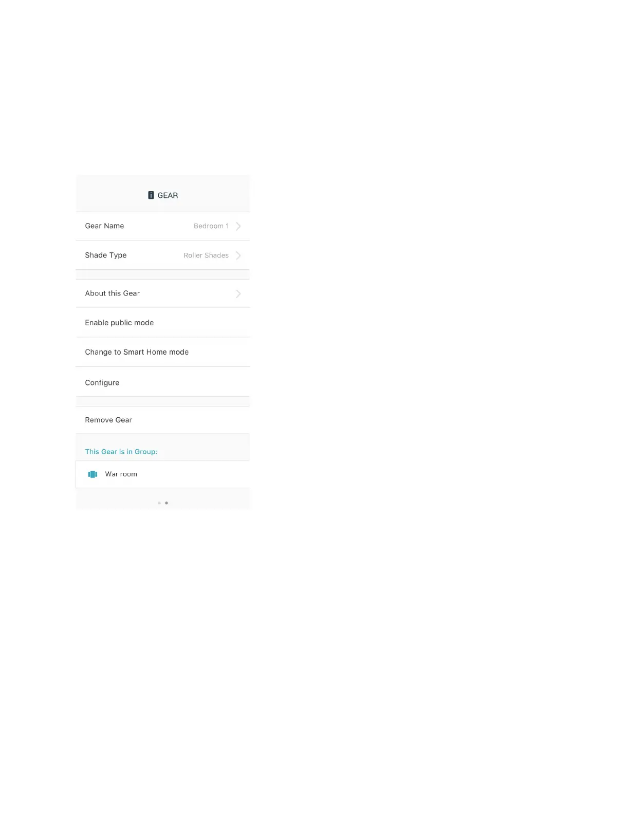Settings can be used to change the Gear name or shade type, reconfigure Gear, enter Smart