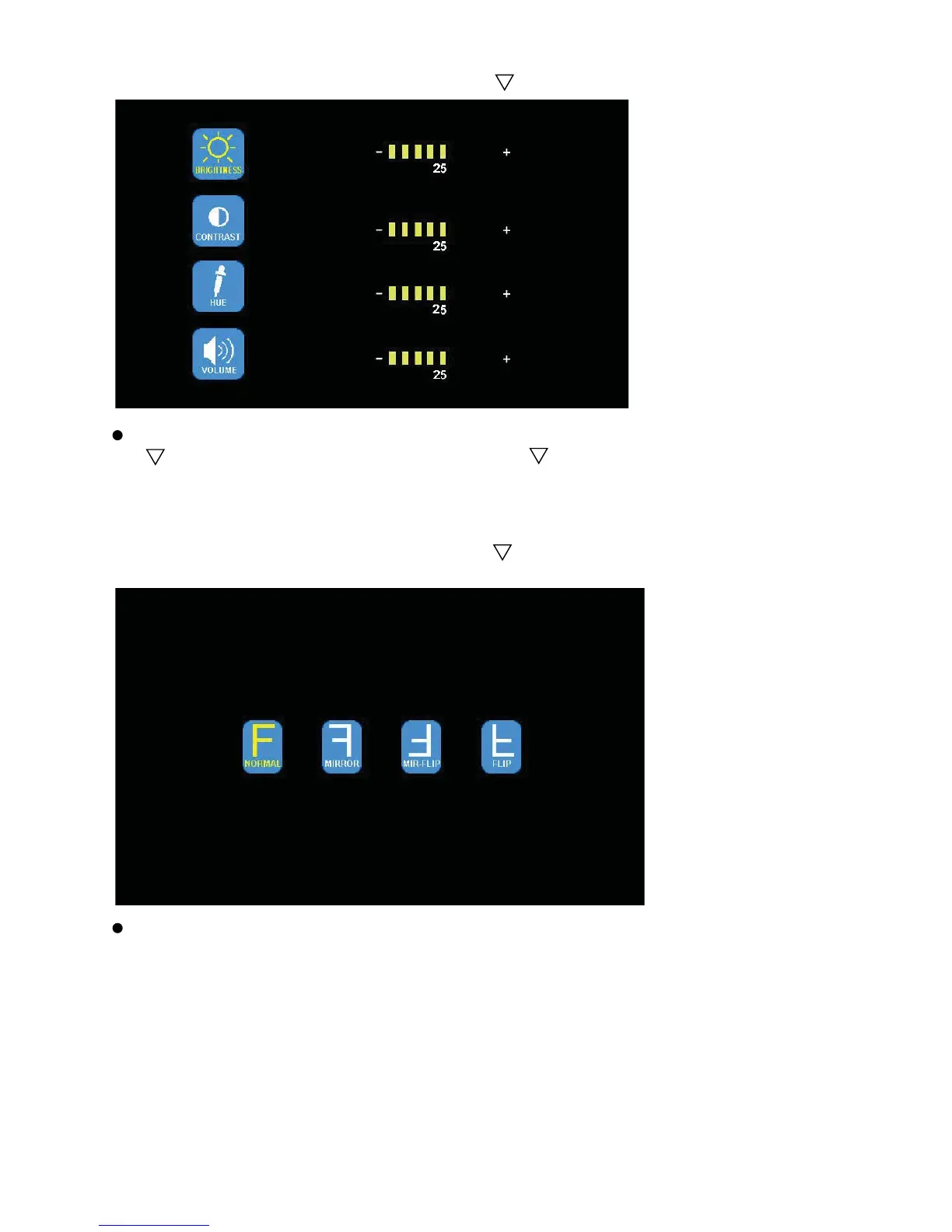 Press - or + to select NORMAL / MIRROR / MIR-FLIP / FLIP. Press MENU