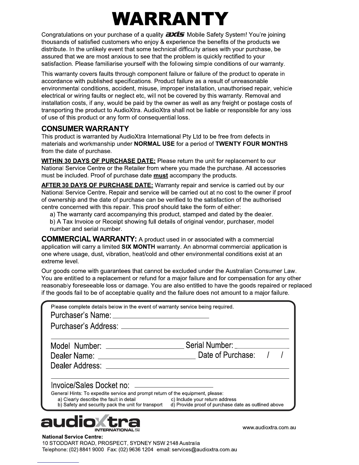 Axis JS056WK - Warranty; Consumer Warranty; Commercial Warranty