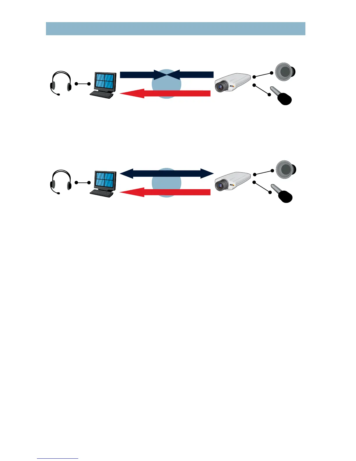Figure 8.3c In half-duplex mode, audio is sent in both directions, but only one party at a time can send. This is