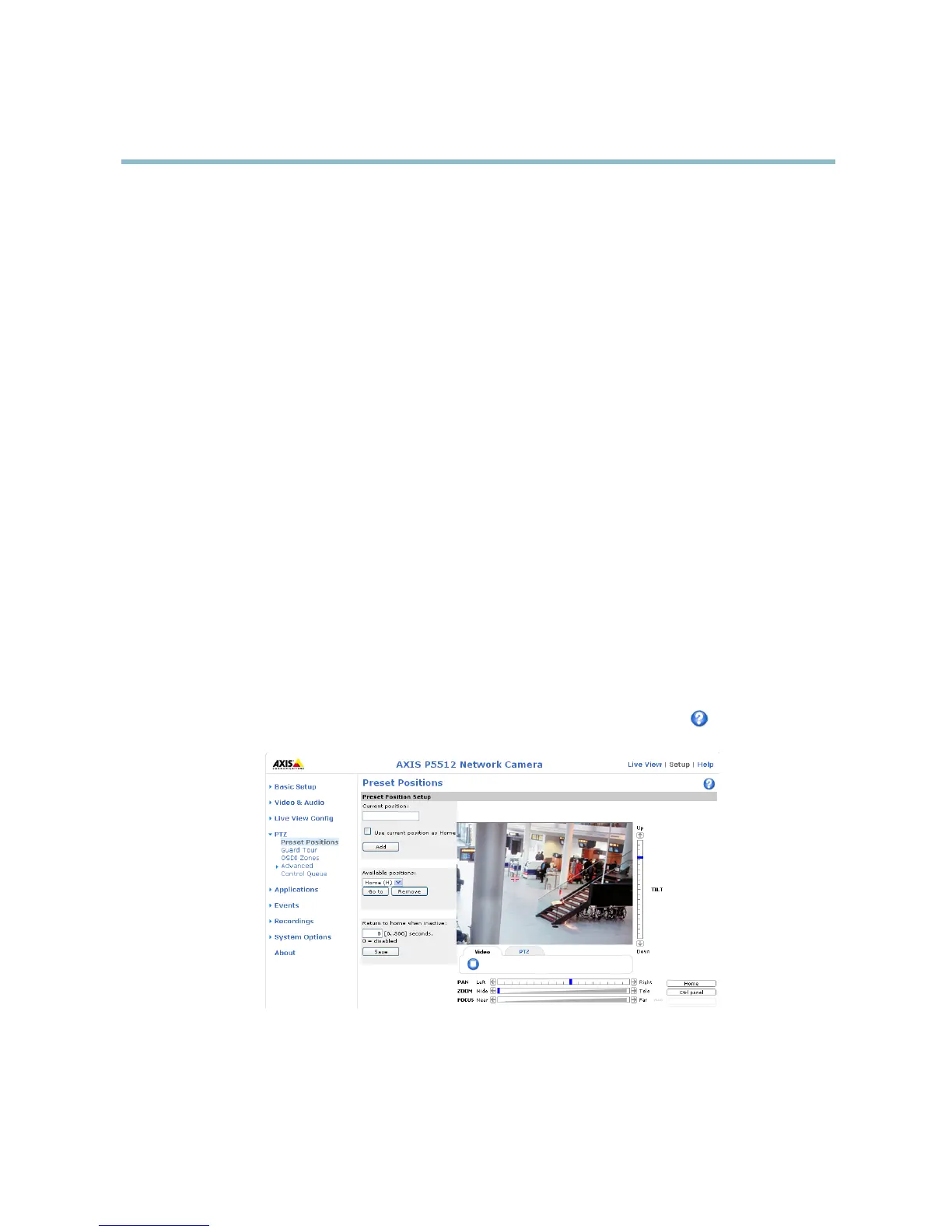 The Hom e position is readily accessible by clicking the Home button on the Live View page and in the Preset Positions se