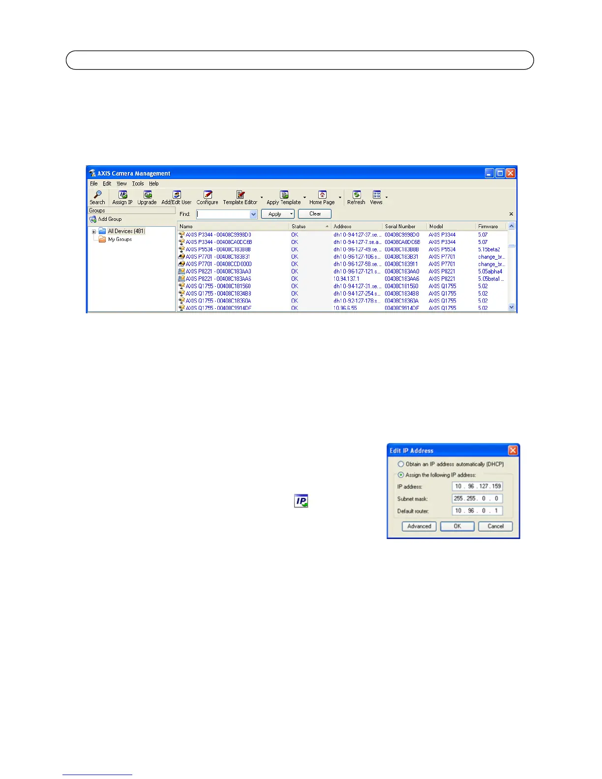 AXIS Camera Management puede detectar automáticamente varios dispositivos Axis, mostrar el