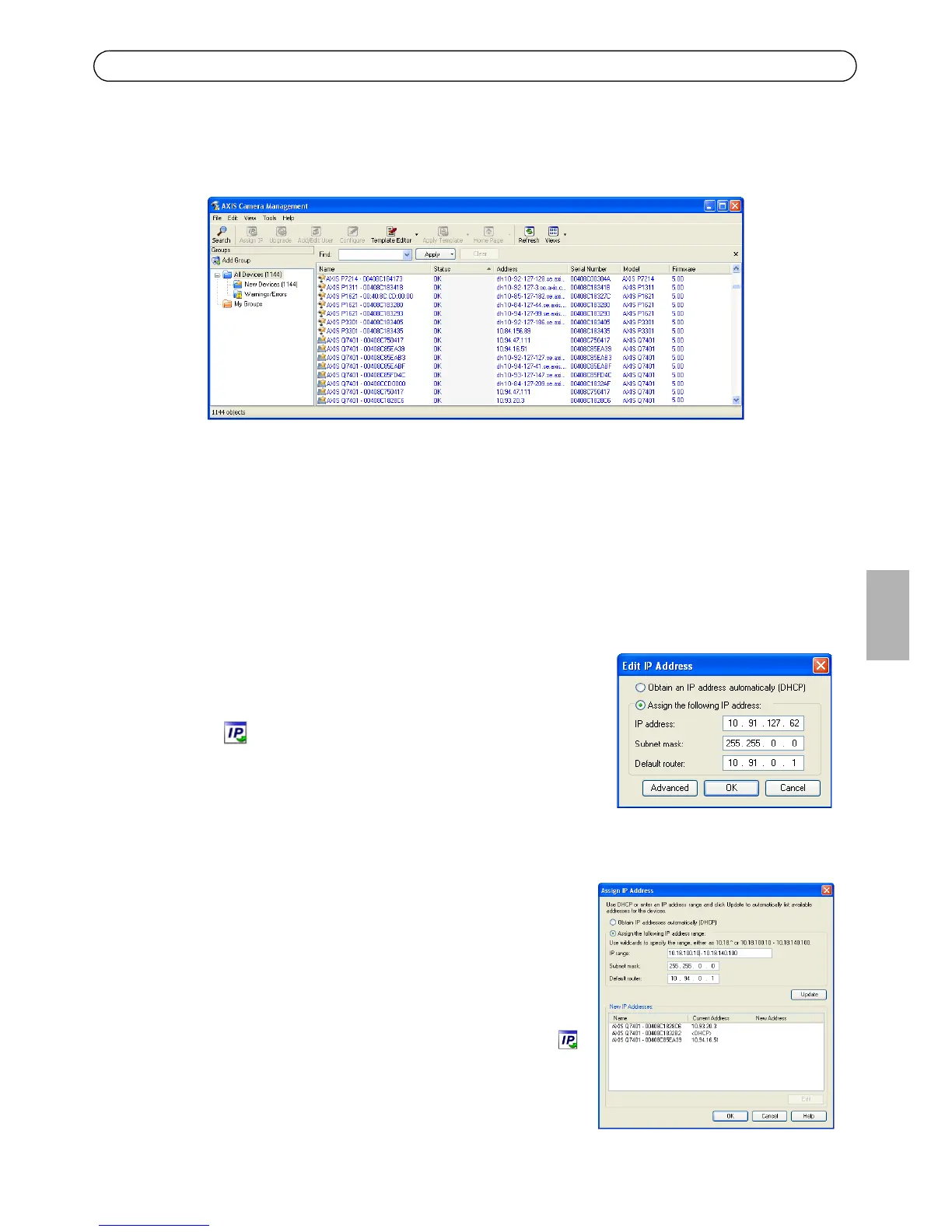 AXIS Camera Management kann IP-Adressen automatisch suchen und festlegen, den