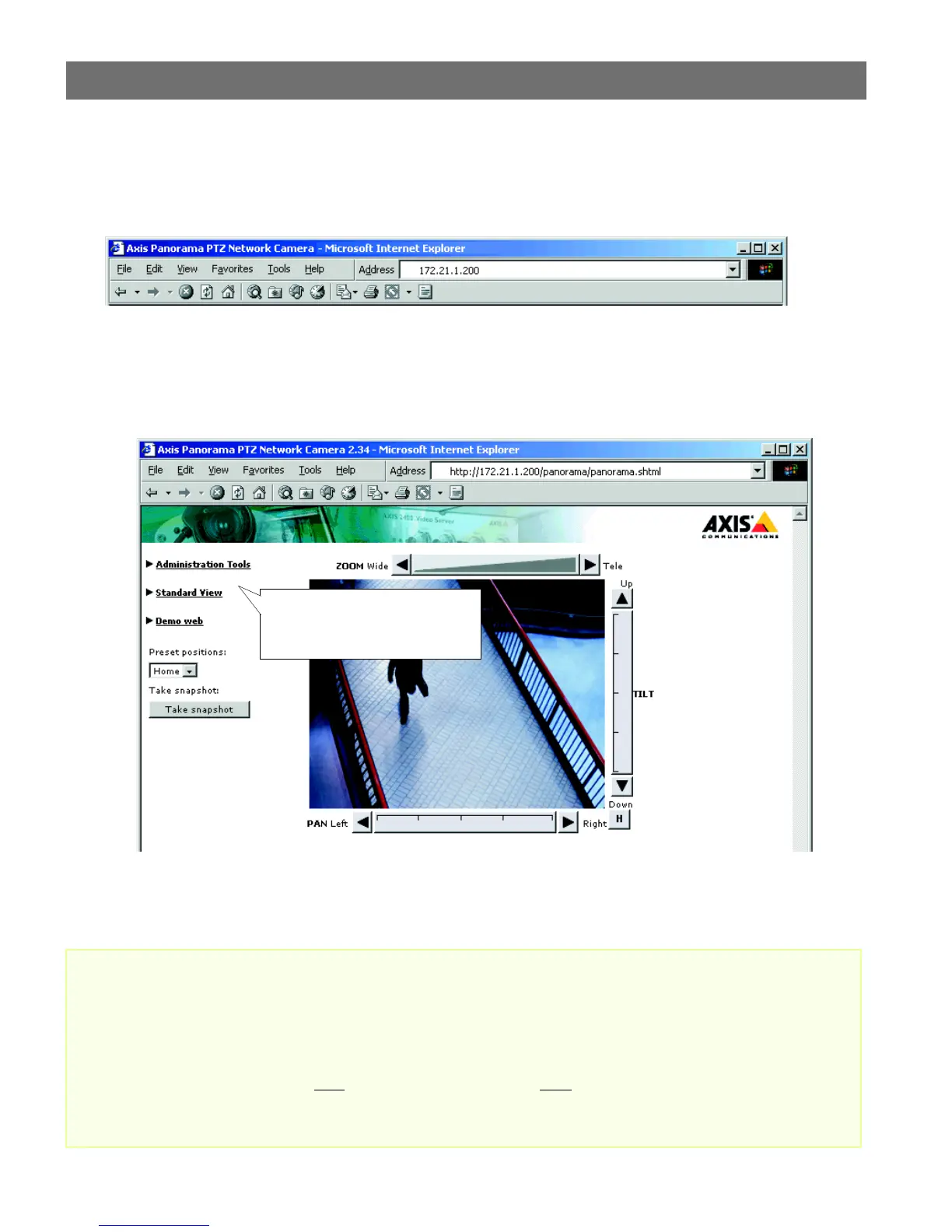 To access the AXIS Panorama PTZ, start your browser and enter the IP address of either camera in