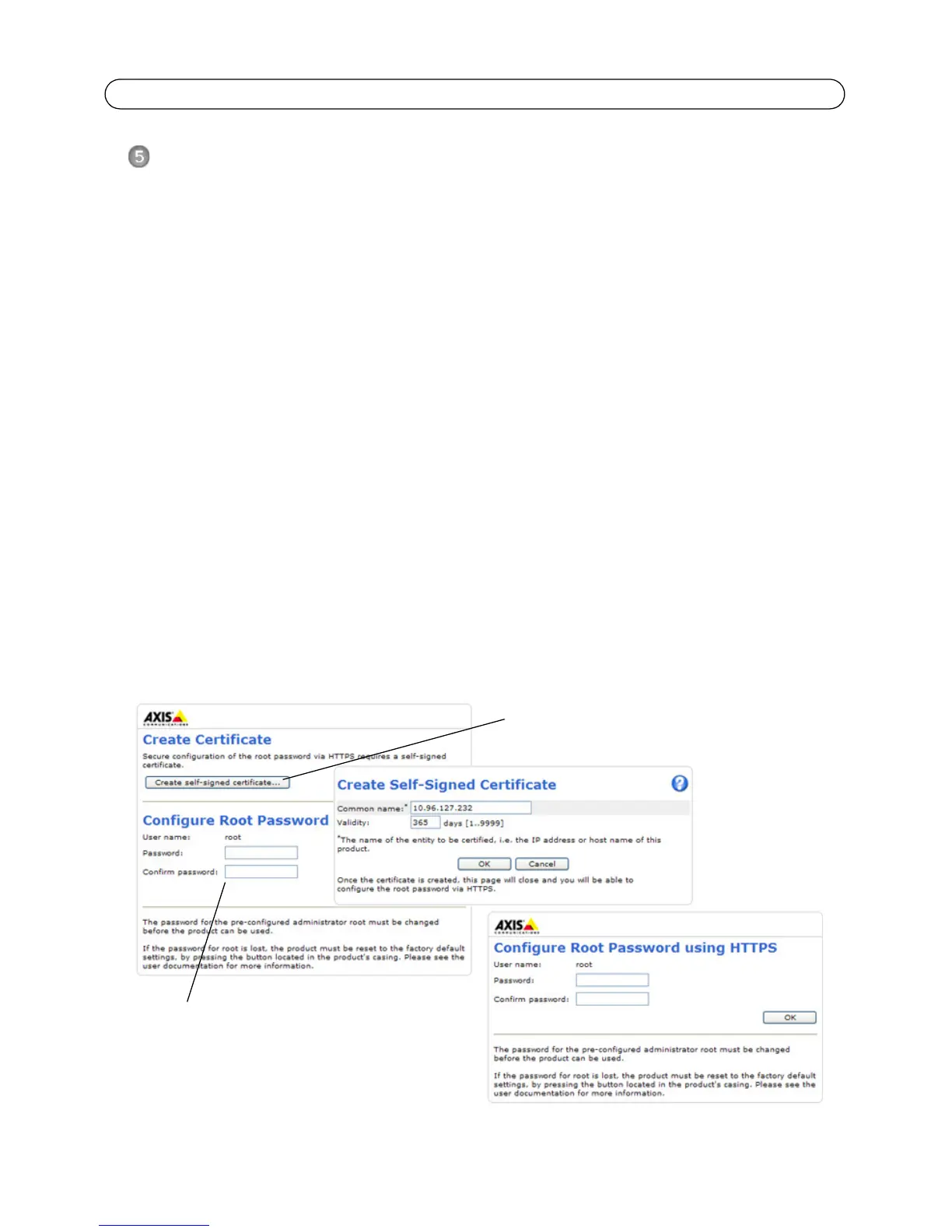 Password' (Configura password root), che viene visualizzata quando si accede alla telecamera per