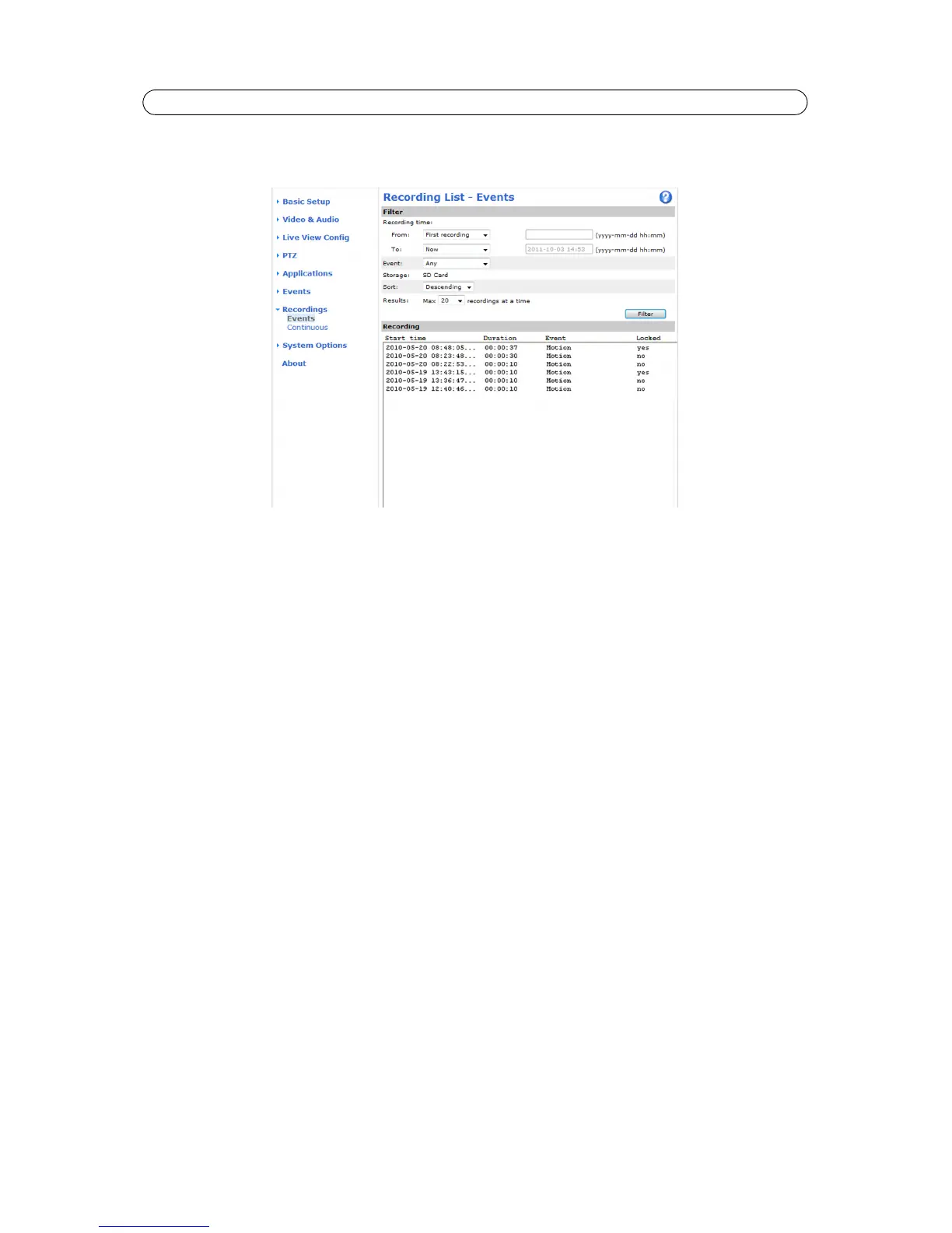 The Recording List web page contains a list of recordings made to the SD memory card. It shows each recording's start time,