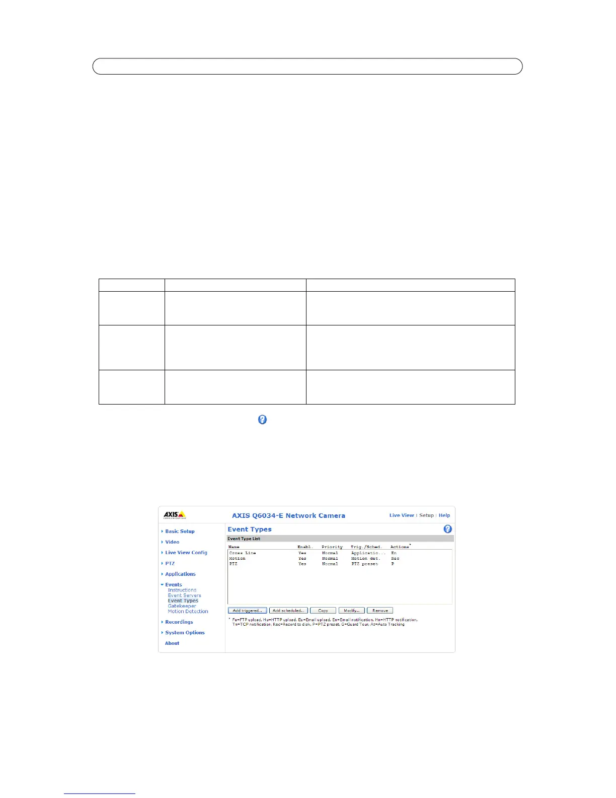 Pre-defined parameters, known as an event or Event Type can trigger certain actions in the camera. A common event type is