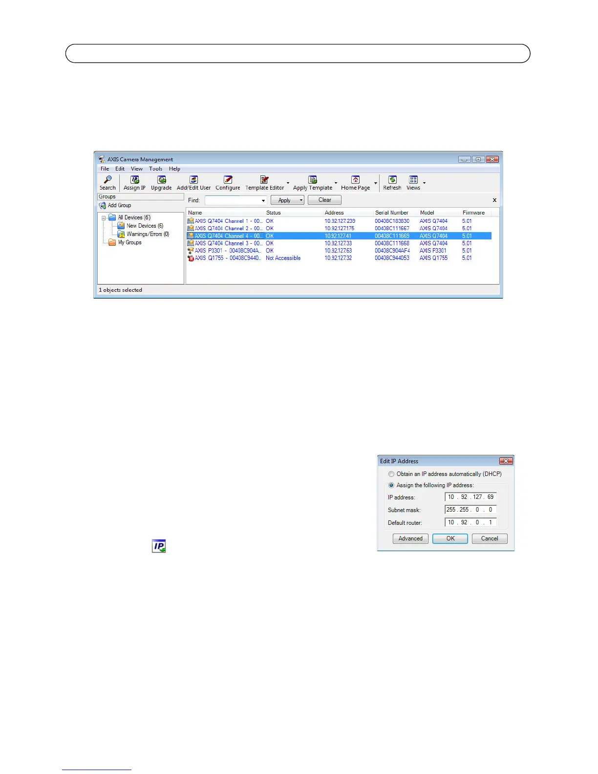 AXIS Camera Management puede buscar y configurar automáticamente direcciones IP, mostrar el