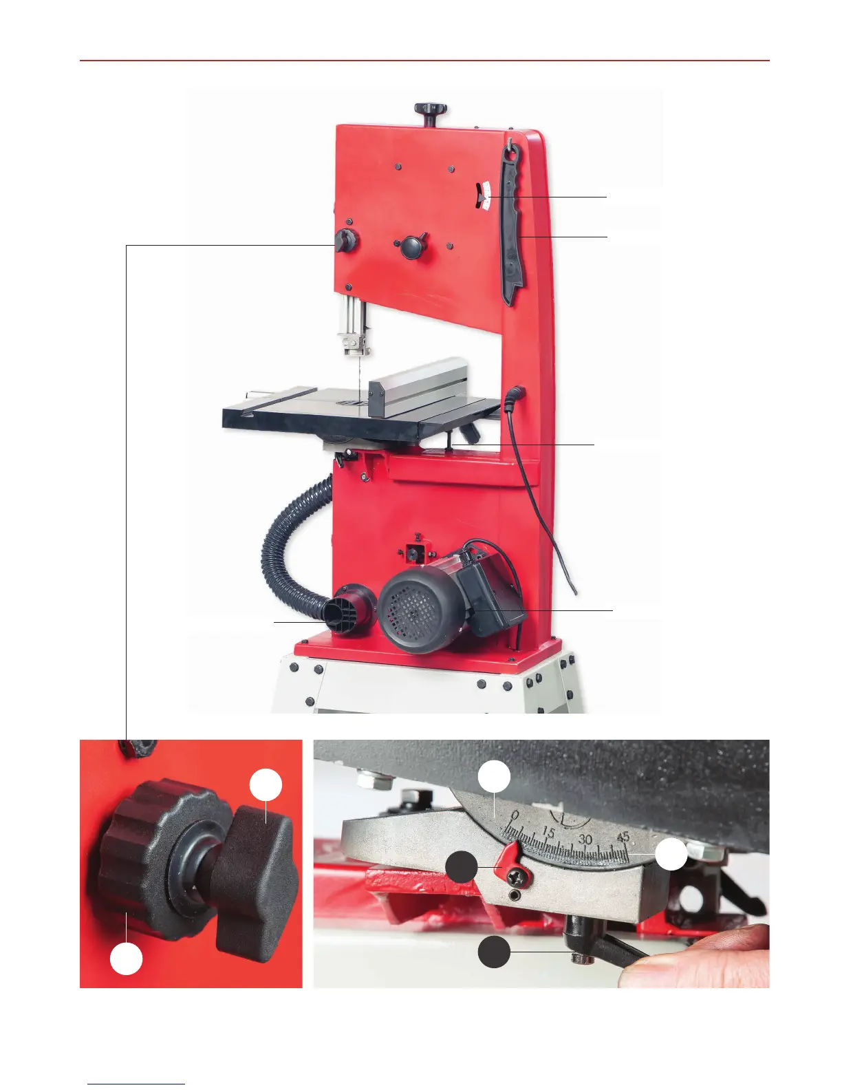 Tilt scale pointer and adjusting screw (I), Lift and shift handle (J)