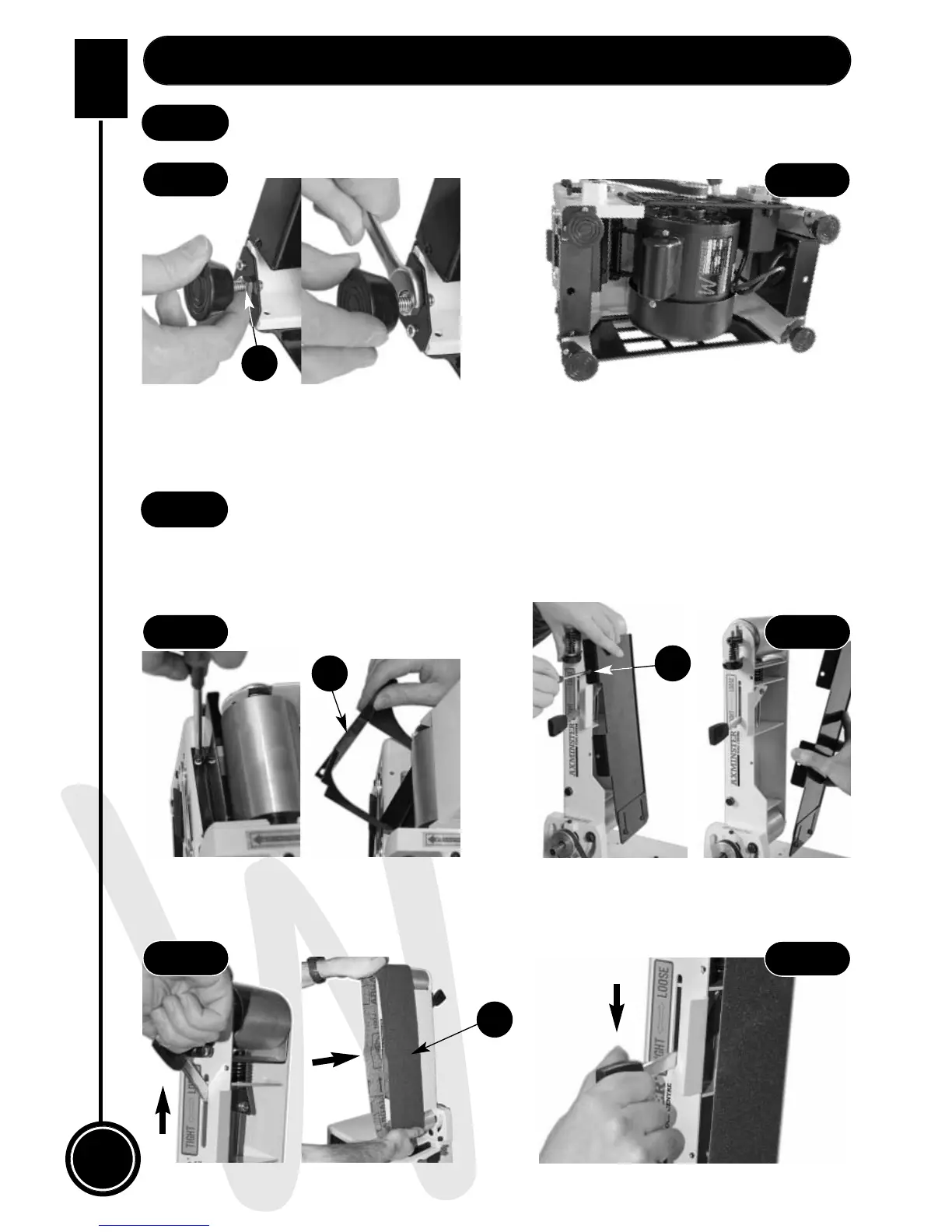 Pull the tensioning lever “UP”, locate the sanding belt (I) & slide it onto the linisher.