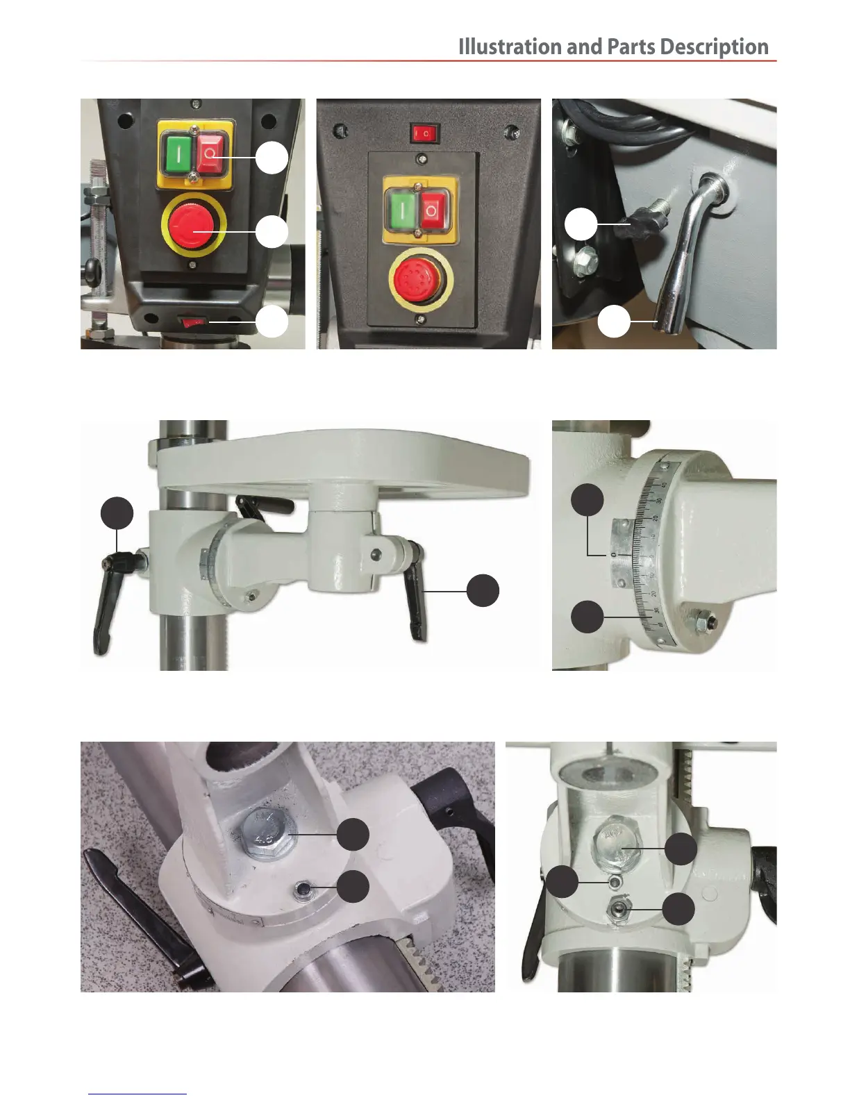 Table tilt clamping bolt (A), 90˚ degrees locking pin (B) ATDP20F Pillar drill table tilt assembly