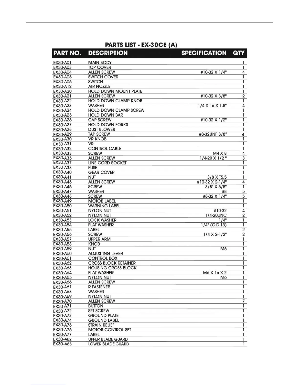 EX-30 Parts List (A)