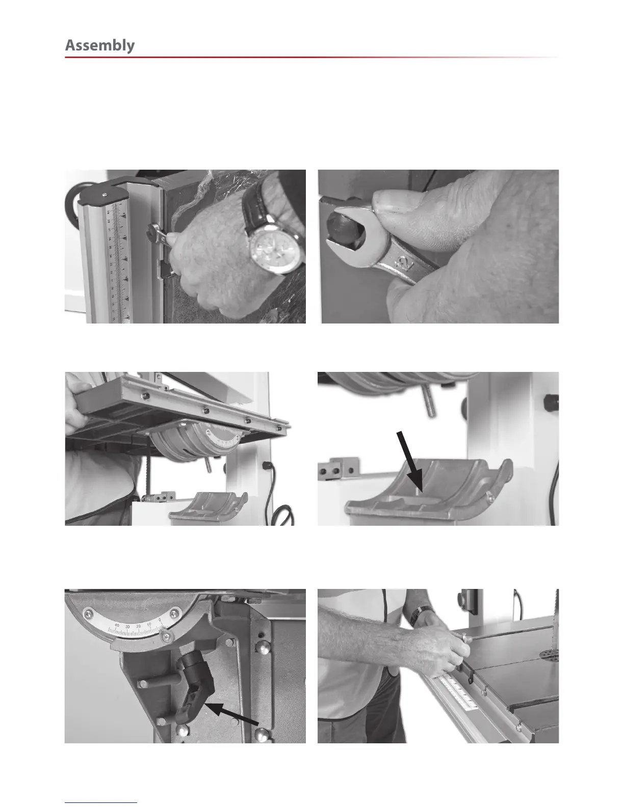 Remove the table clamping handle and washer beneath the table,place safely aside. Slide the blade through