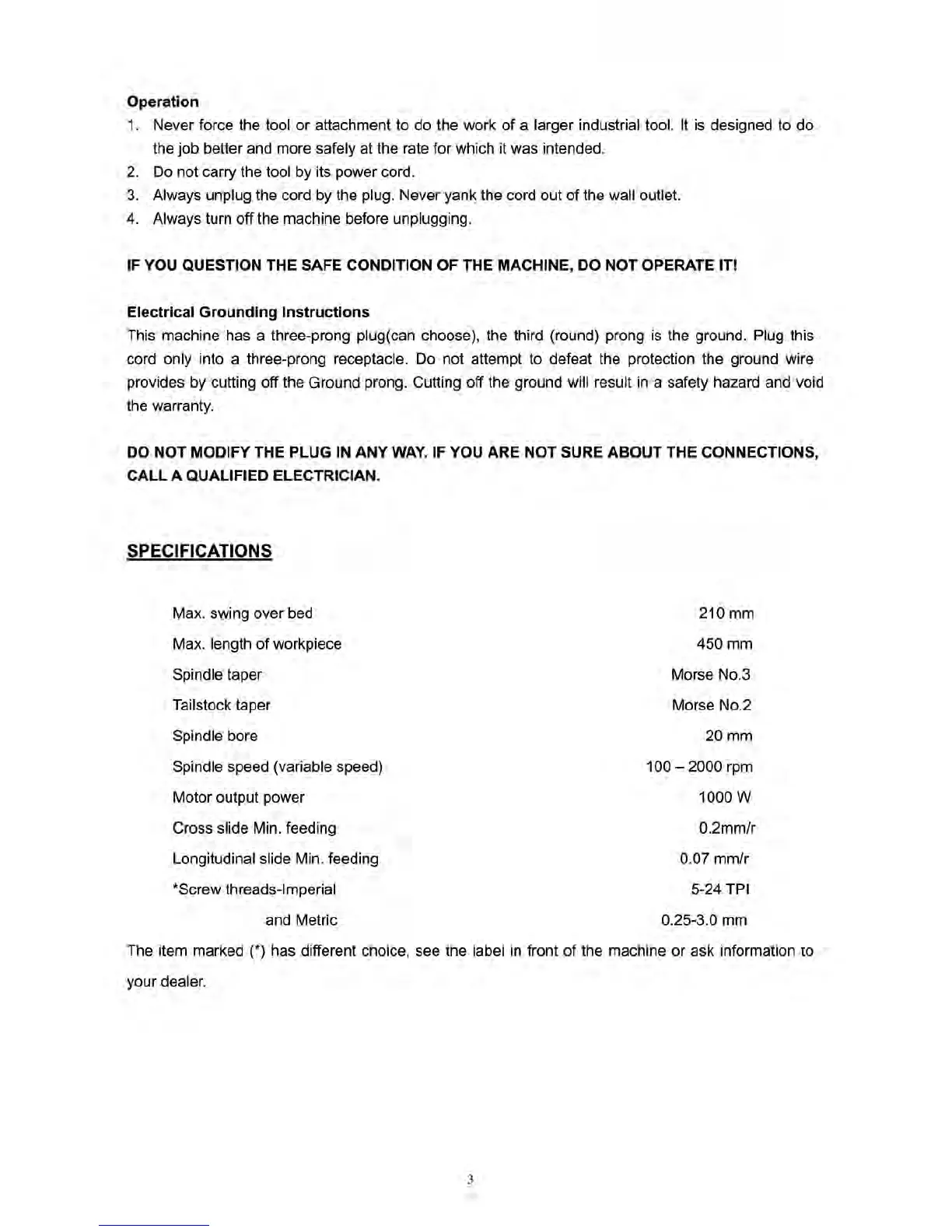 Axminster SIEG C4 - Specifications; Operation; Electrical Grounding Instructions