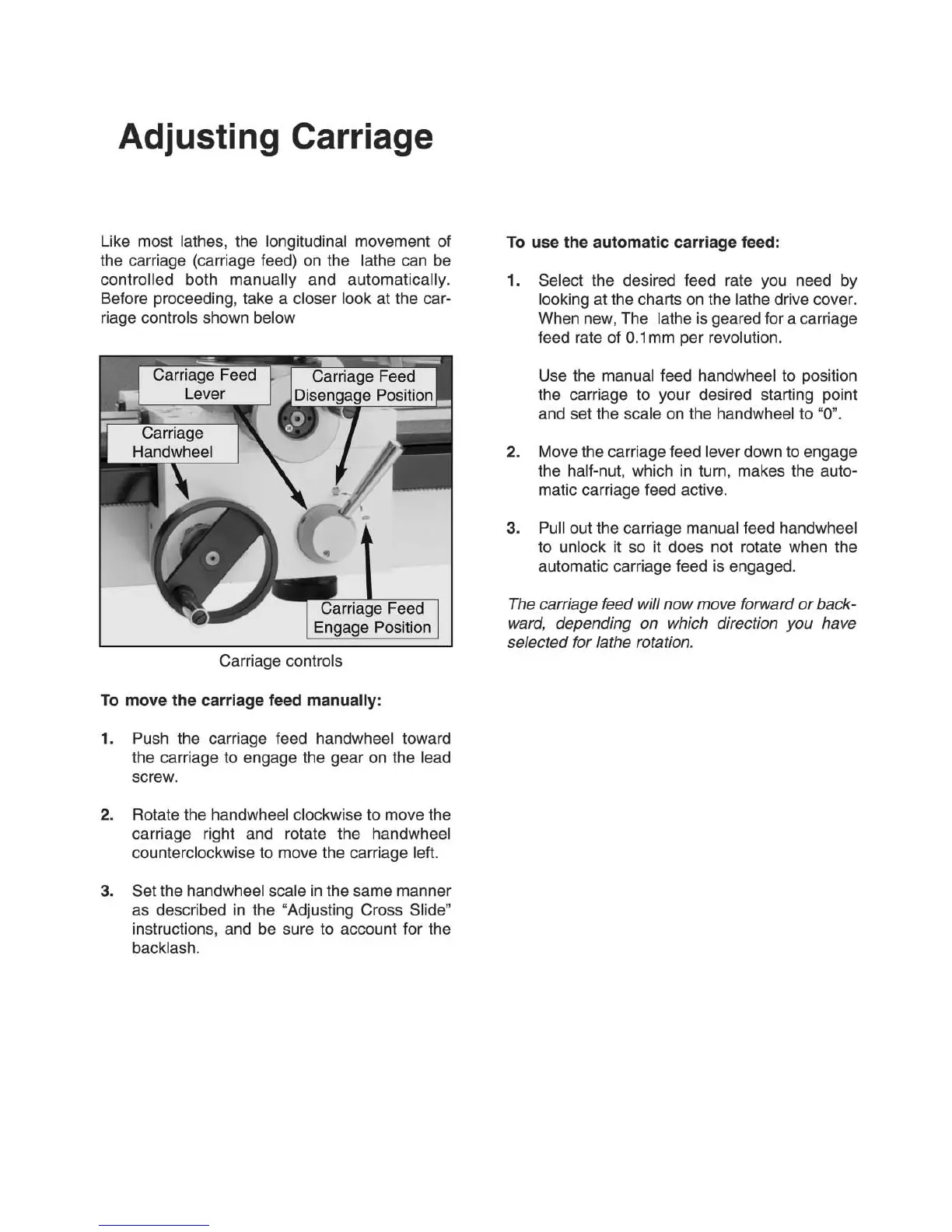 Axminster SIEG SC6 - Adjusting Carriage; To Move the Carriage Feed Manually; To Use the Automatic Carriage Feed