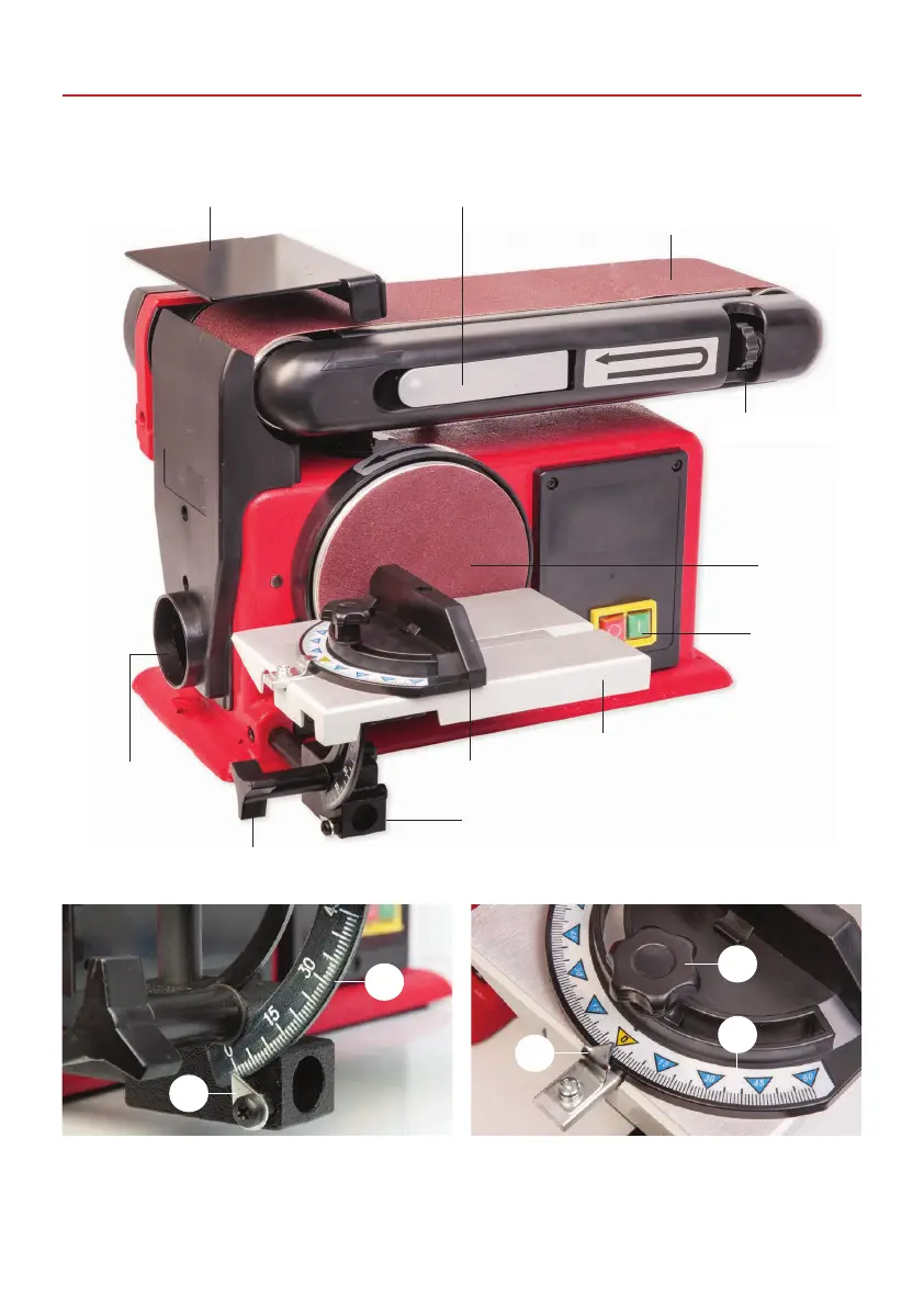 Worktable tilt scale (A) and pointer (B) Mitre fence pointer (A), scale (B) and clamping knob (C)