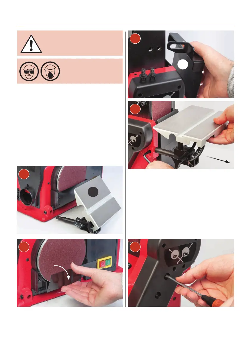 Remove the linisher’s guard (E) or worktable (B) and clean