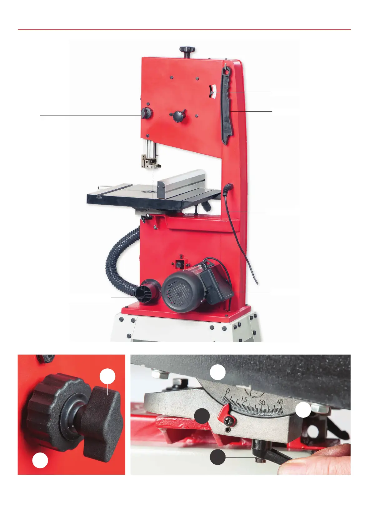 Tilt scale pointer and adjusting screw (E), Lift and shift handle (F)