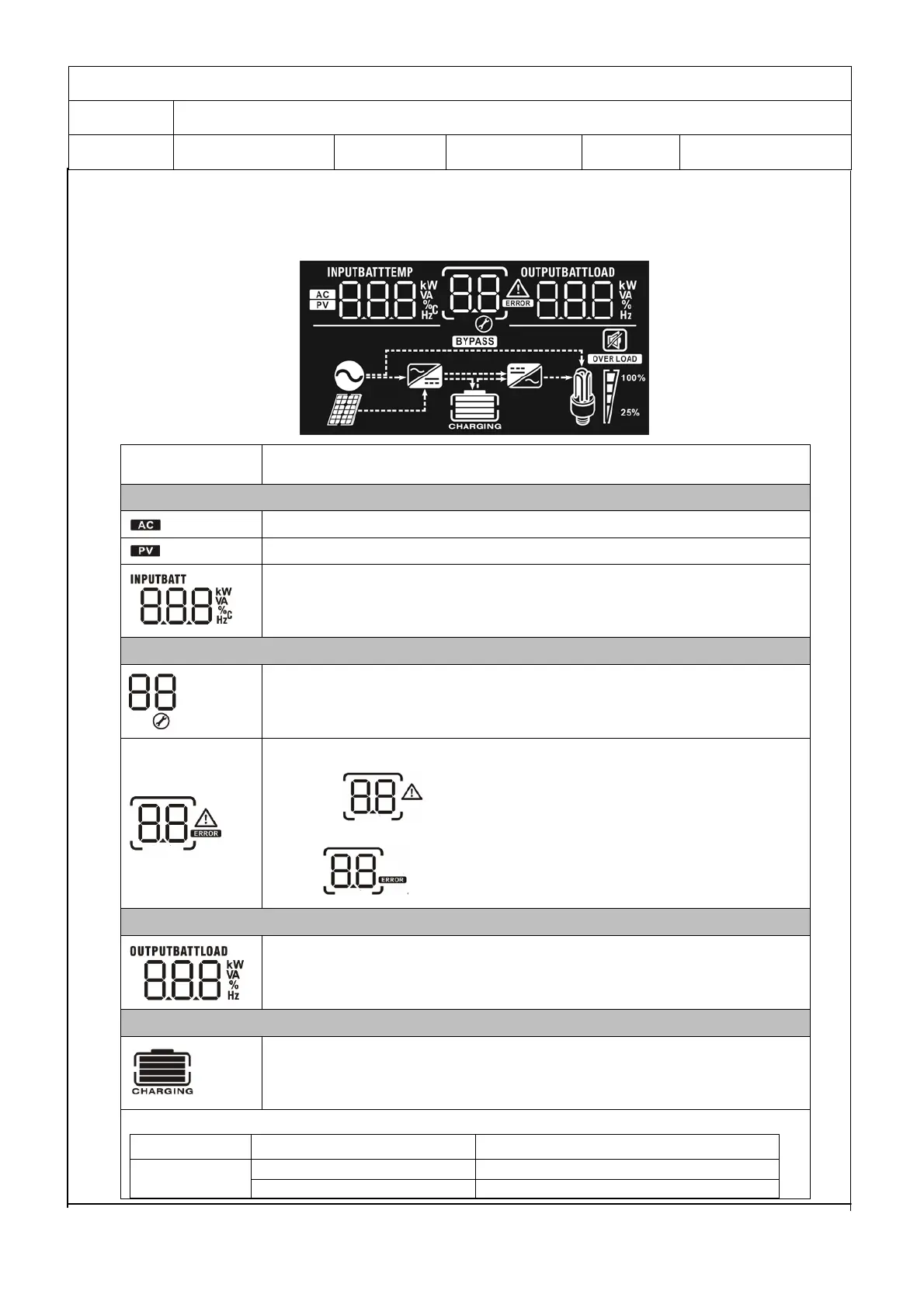 Indicate input voltage, input frequency, PV voltage, battery voltage.
