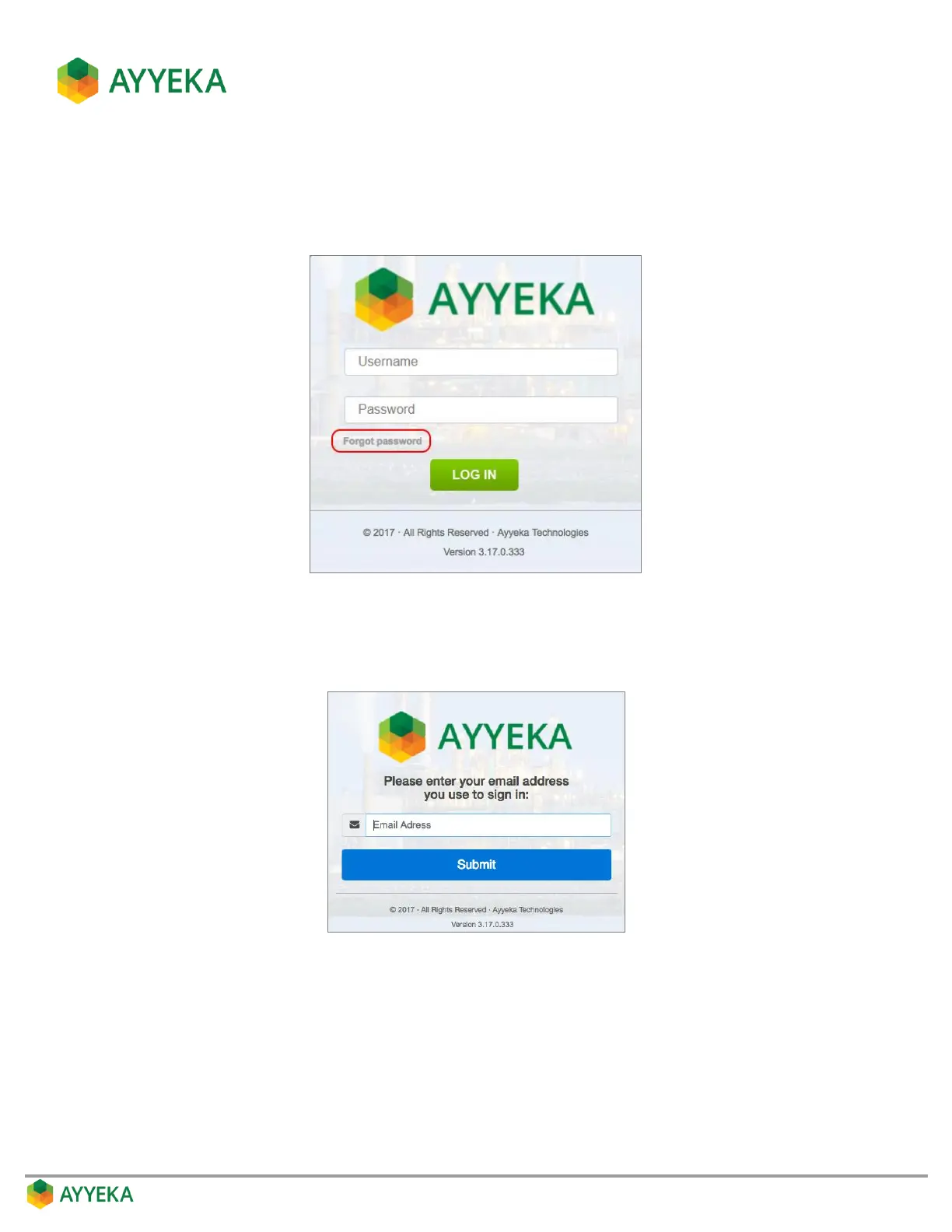 2. In the window that appears, enter the email address associated with your Ayyeka user account, and click