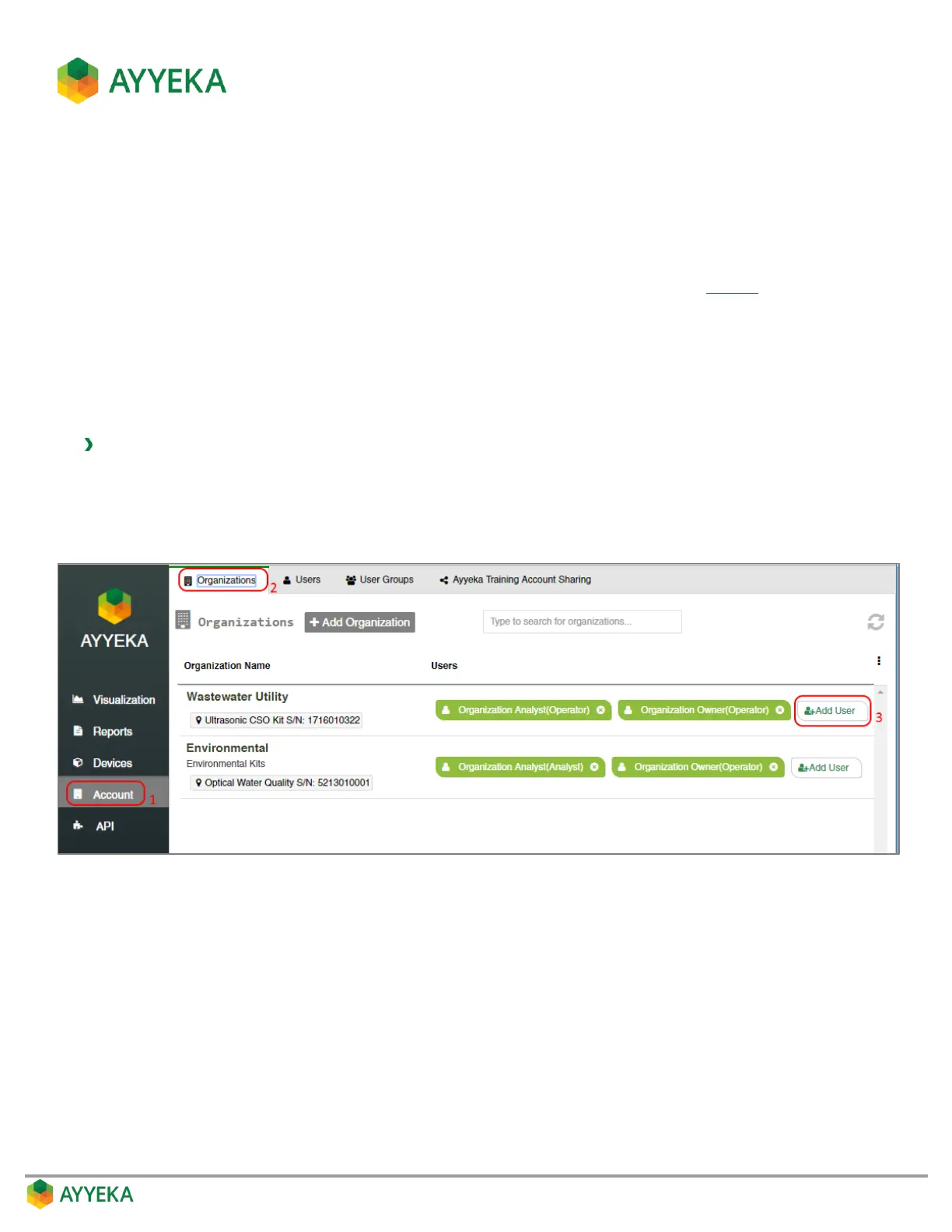 3. Click + Add User in the Users column of the organization to which you want to add a user.