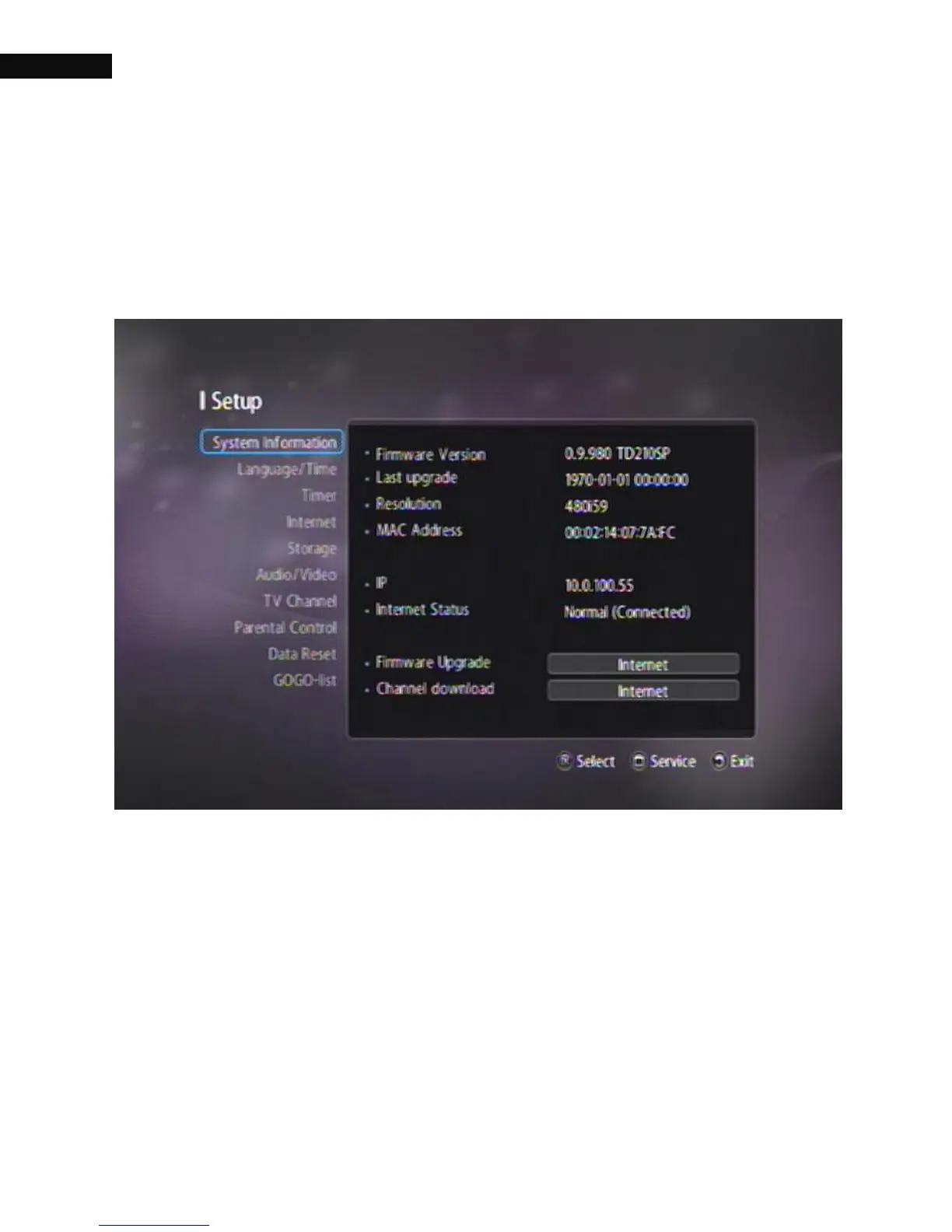 menu; Firmware Version, Last upgrade, Resolution, MAC address,