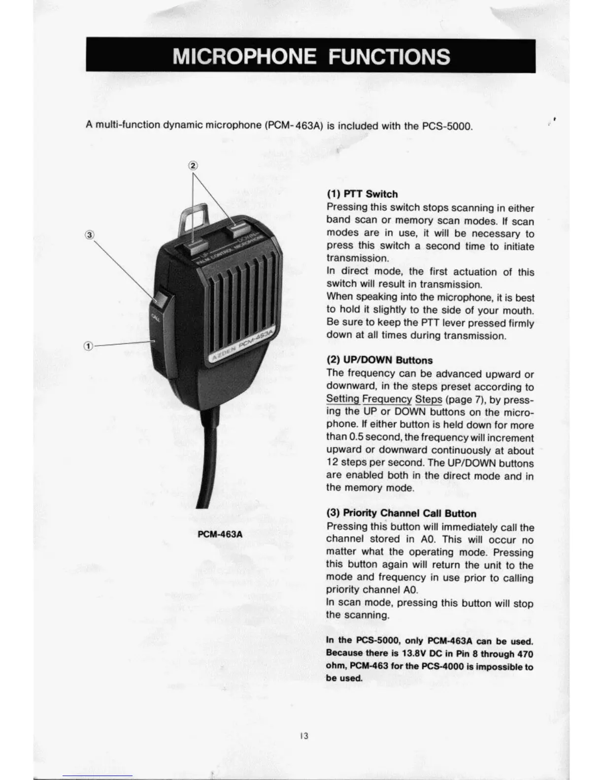 Azden PCS-5000 - Microphone Functions; PTT Switch; Up;Down Buttons; Priority Channel Call Button