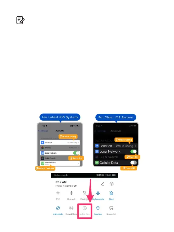 ②ForOlderiOSSystem:Setting→AZDOME→Disablethe‘ CellularData’.