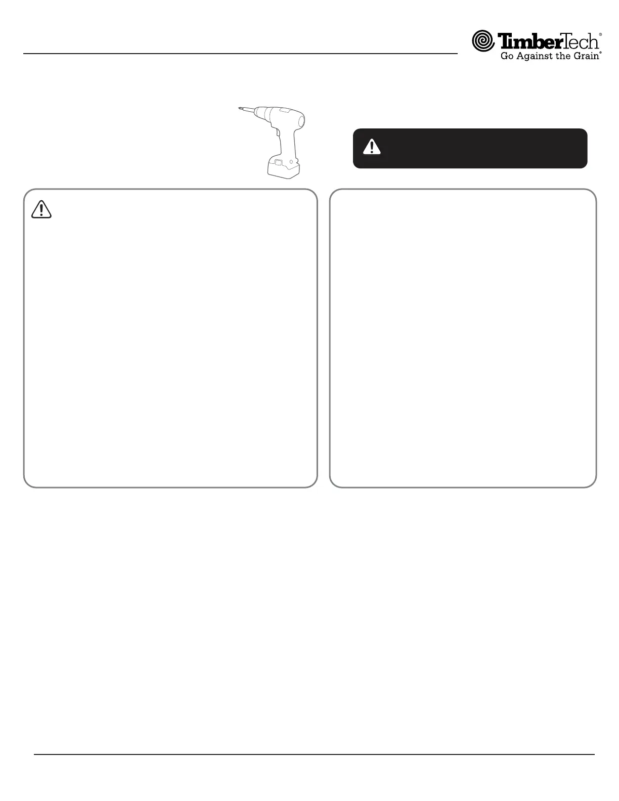 • Pre-drilling is required for installation into TimberTech decking or