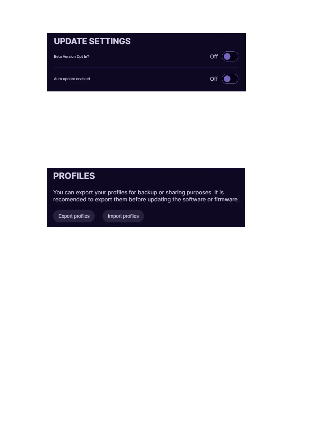(2) At the Profiles option it is possible to Export and Import your profiles.