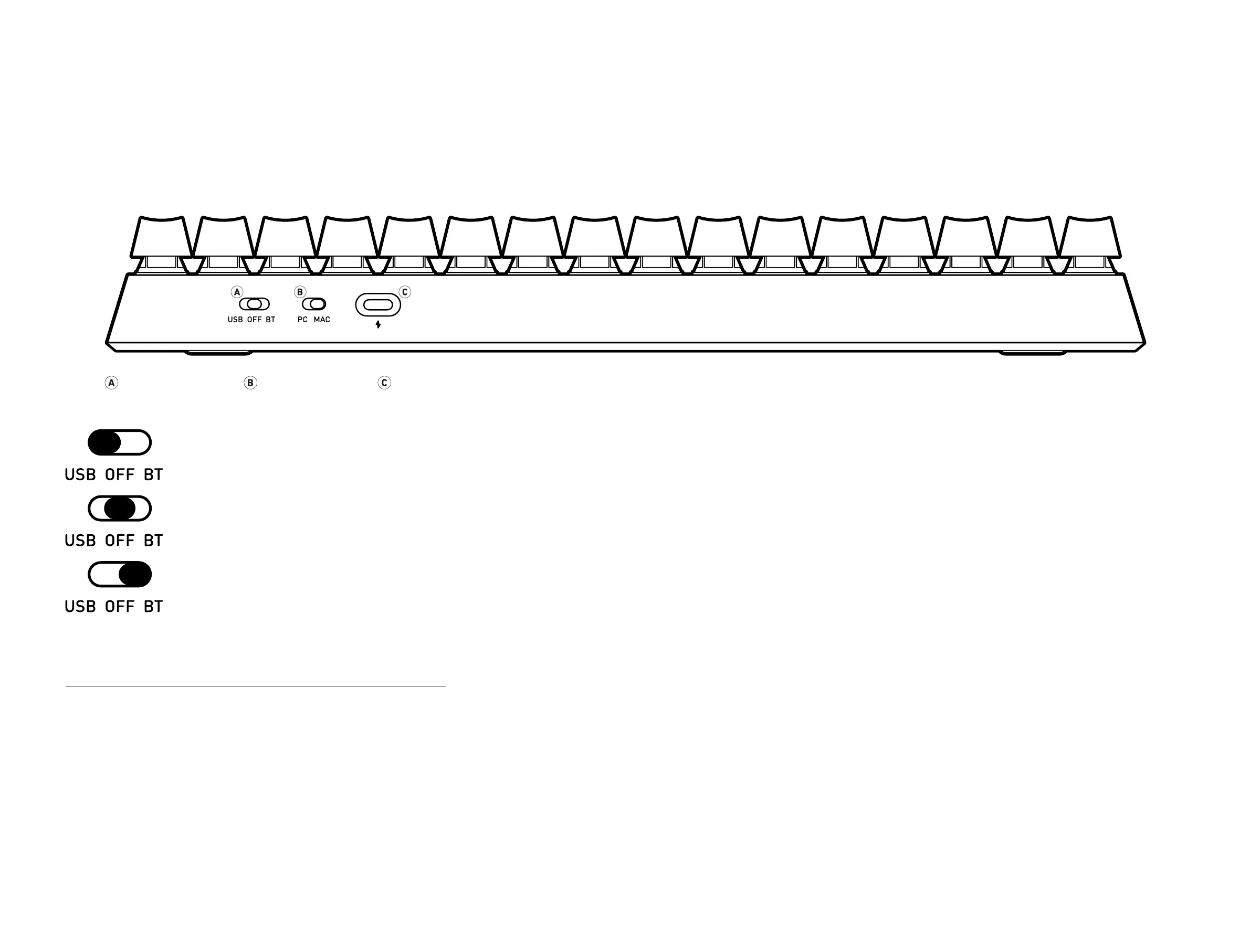 OFF : In OFF mode, all circuitry is off. This is ideal when the keyboard will not