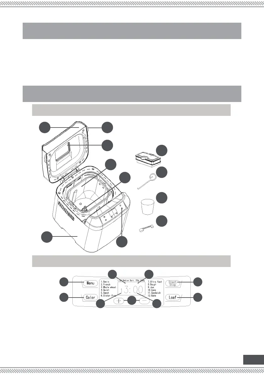 1. Menu. Press this button continuously to shift between its 12 baking programs.