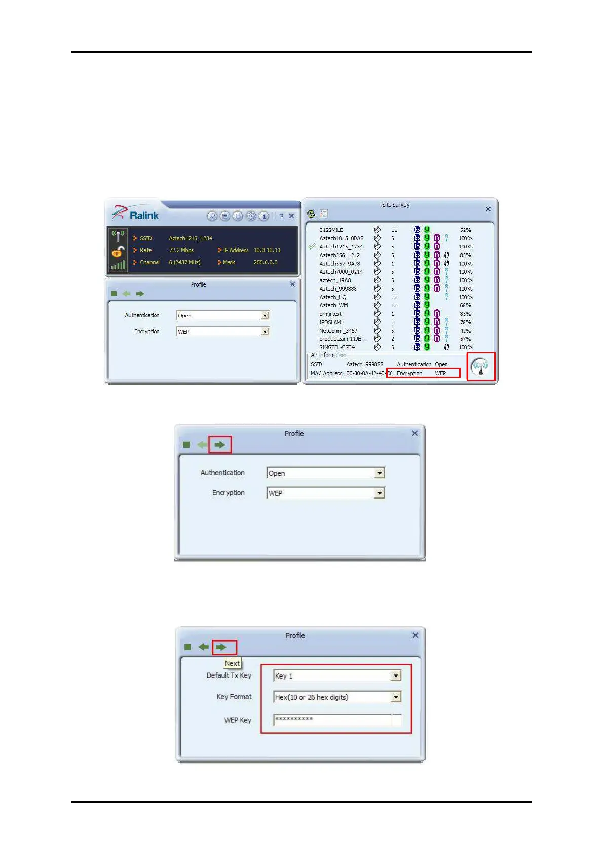 3. Select the Default Key and Key format set on the AP then enter the WEP key on
