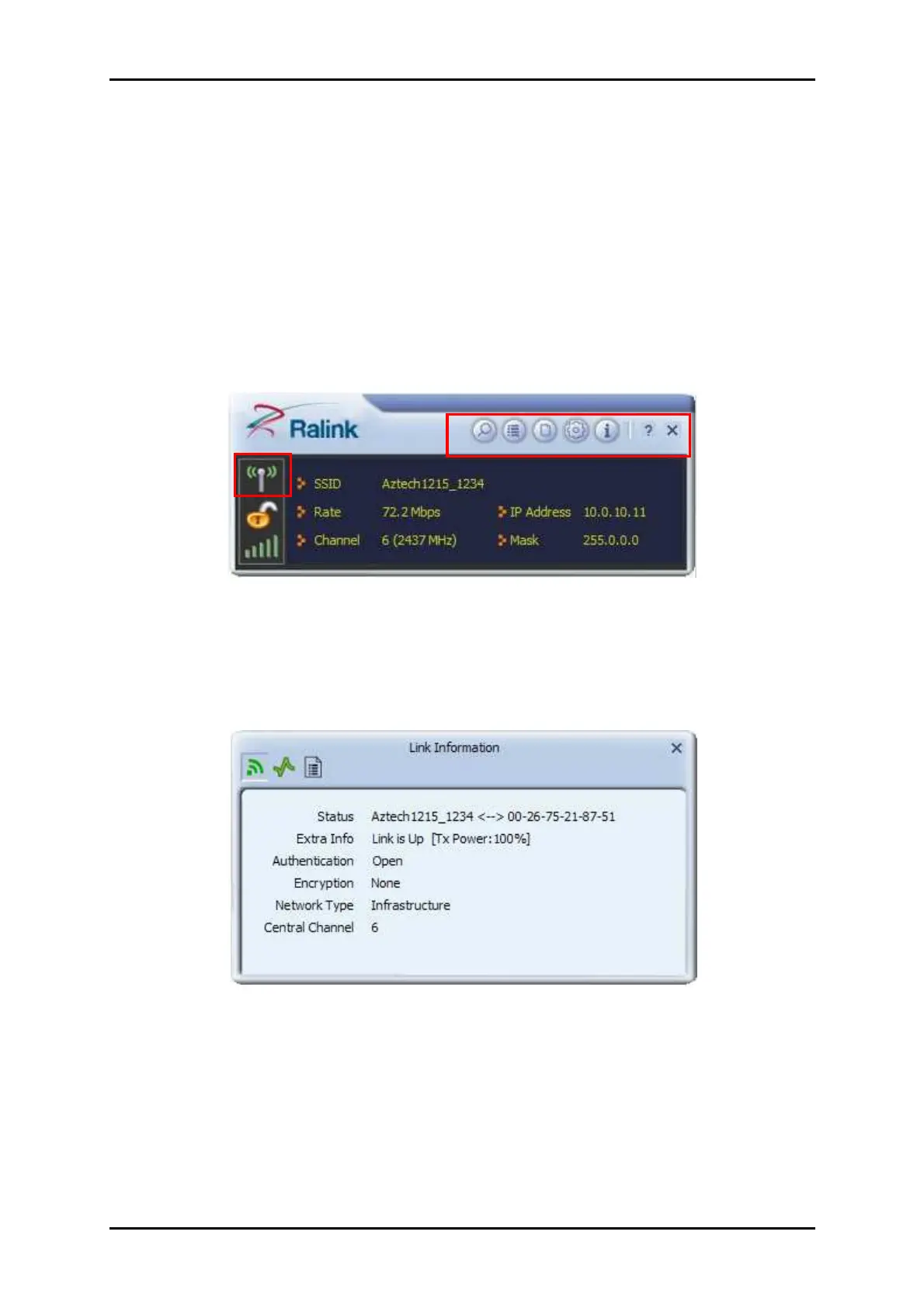 Includes buttons for the Site Survey, Link Information, Profile page, Advanced page, the
