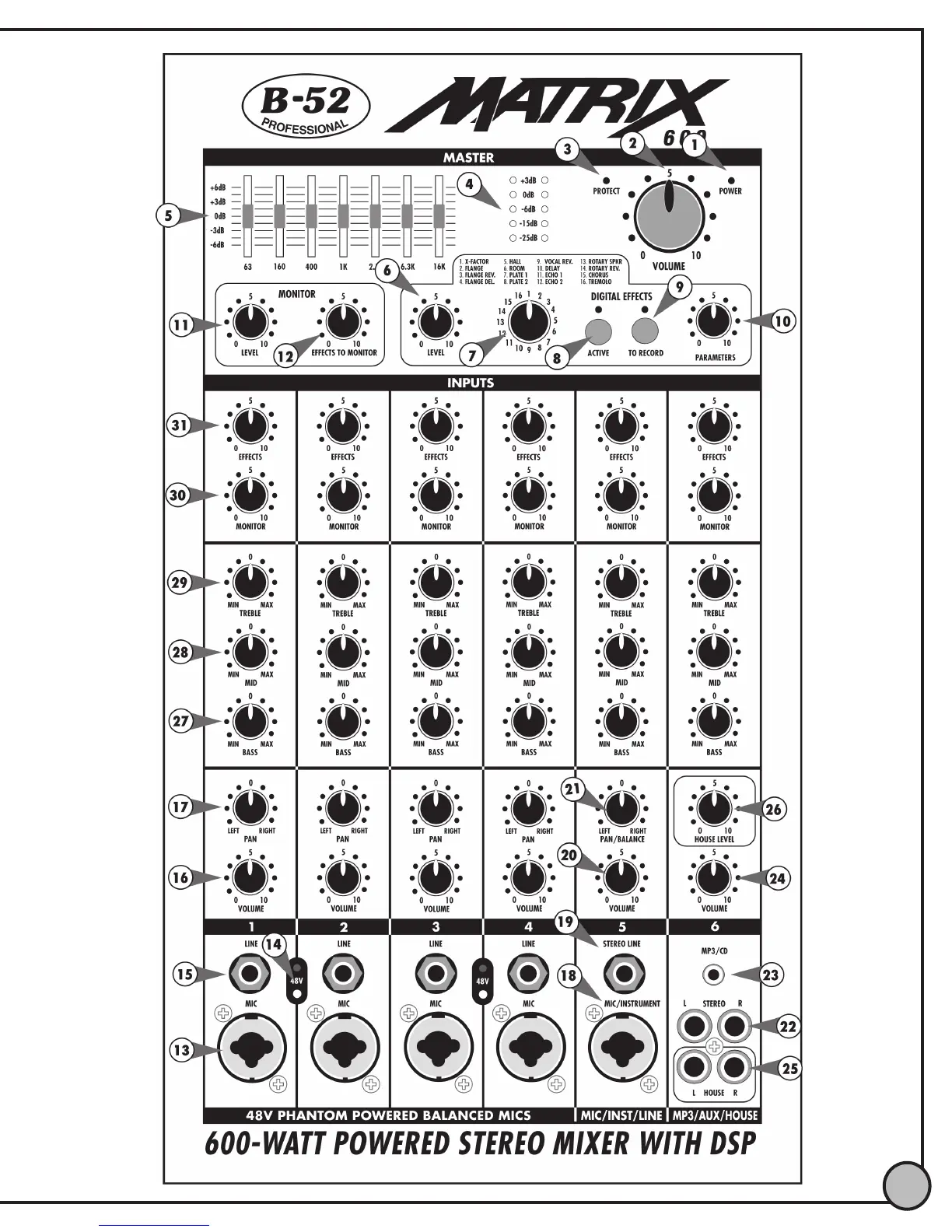 B-52 MATRIX-600 - Front Panel Controls and Connectors (Continued); Input Channel 6 and General Input Notes