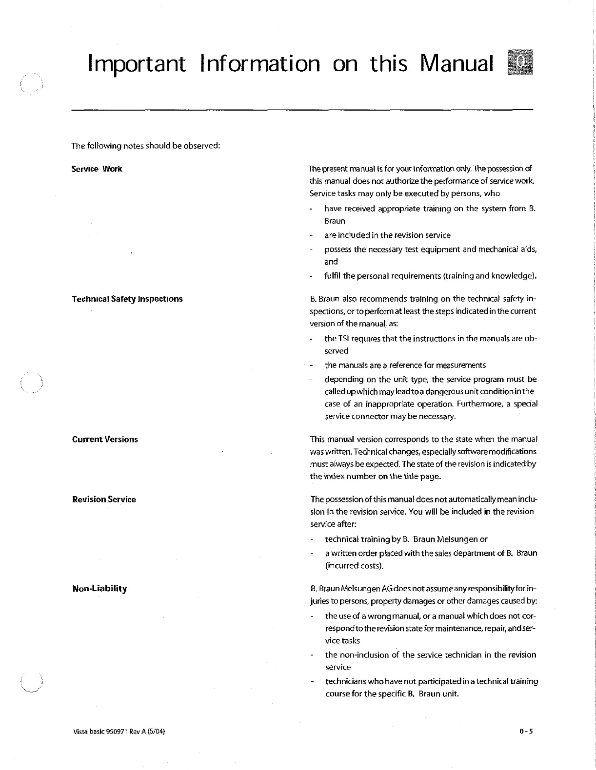 B. Braun Vista basic - Important Information on this Manual; Operational Guidelines and Safety; Checks after Repair