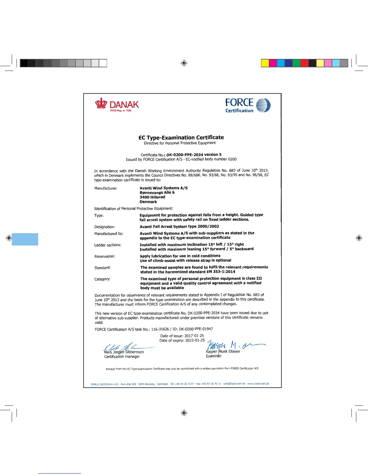 CE certificate of AVANTI Fall Protection System with Runner 2000/2002: