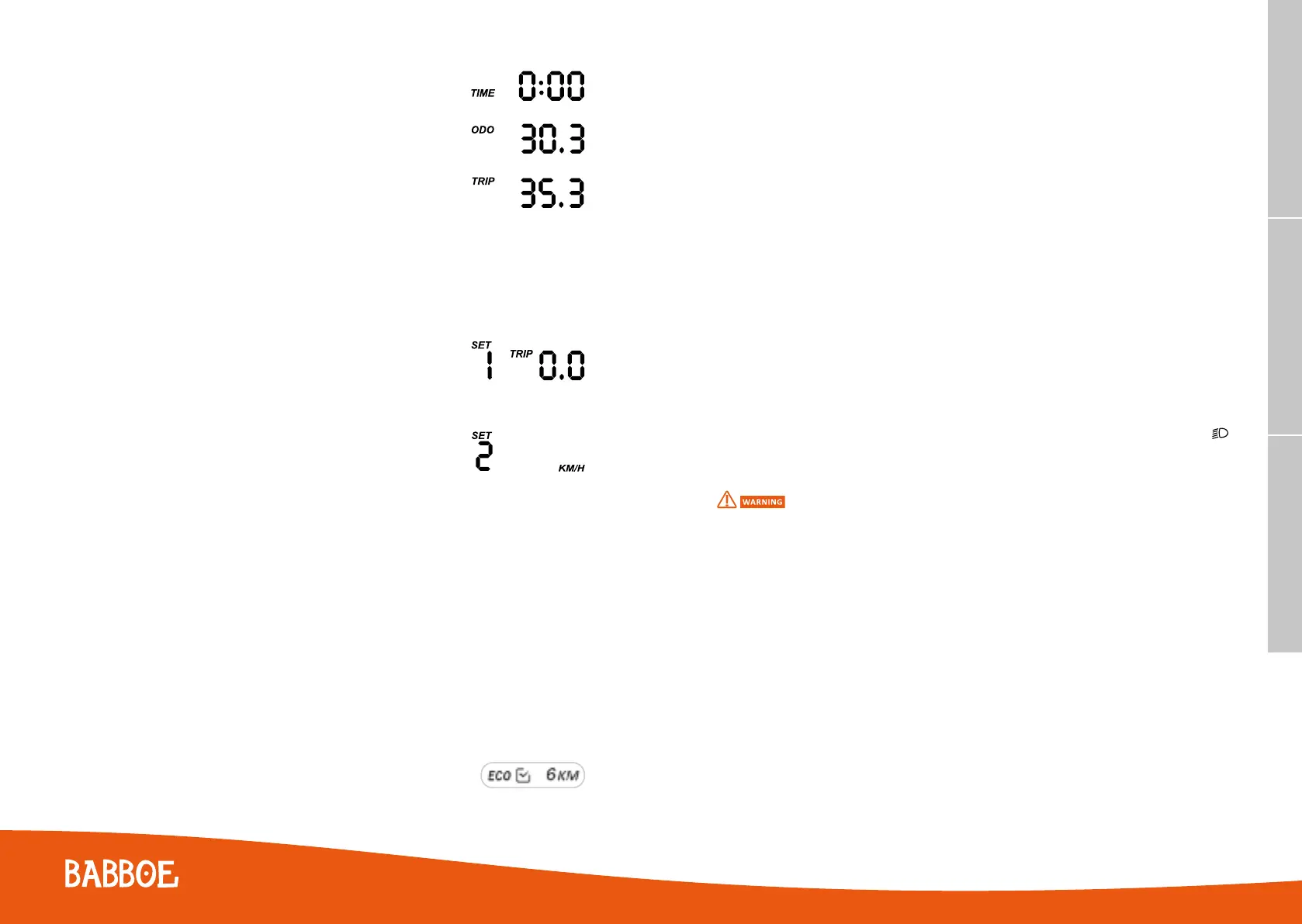 voyant du niveau ECO s’affichera à l’écran et la vitesse sera bloquée sur 6 km/h. L’assistance de marche arrière s’arrête