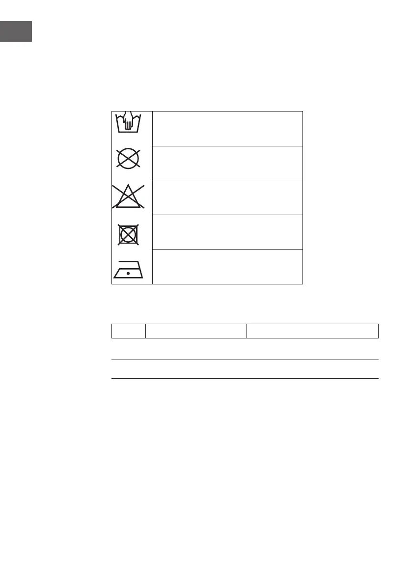 2. Använd inga lösningsmedel, stryks ej, torktumlas ej, lufttorkas platt.