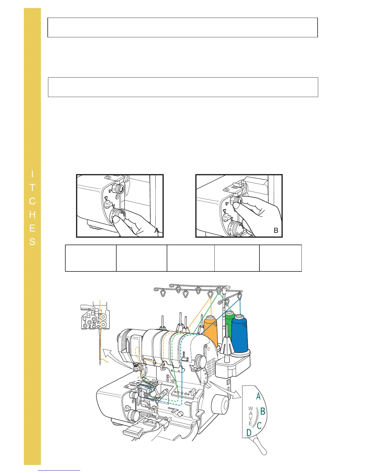 With the stitch selector set on "D", a narrow hem can become a rolled edge. The fabric edge rolls around the