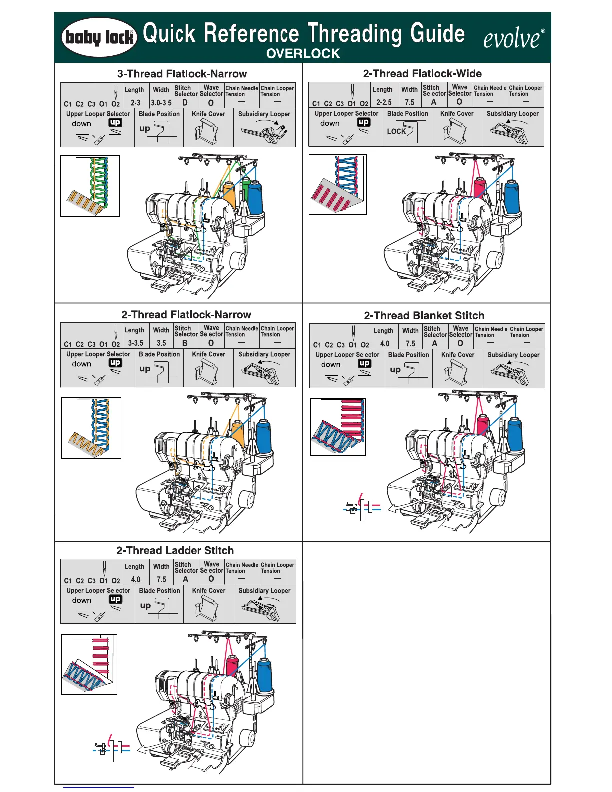 Baby Lock evolve - 3-Thread Flatlock-Narrow; 2-Thread Flatlock-Wide; 2-Thread Flatlock-Narrow; 2-Thread Blanket Stitch