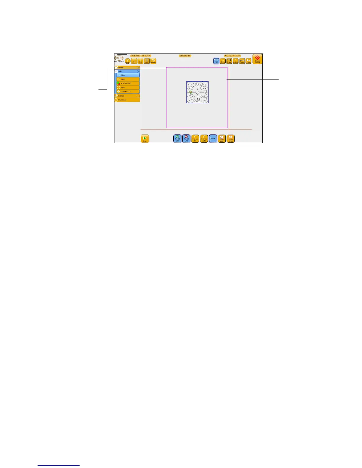 design’s bounding box to ensure the design will quilt where expected. If the Stch buon is enabled