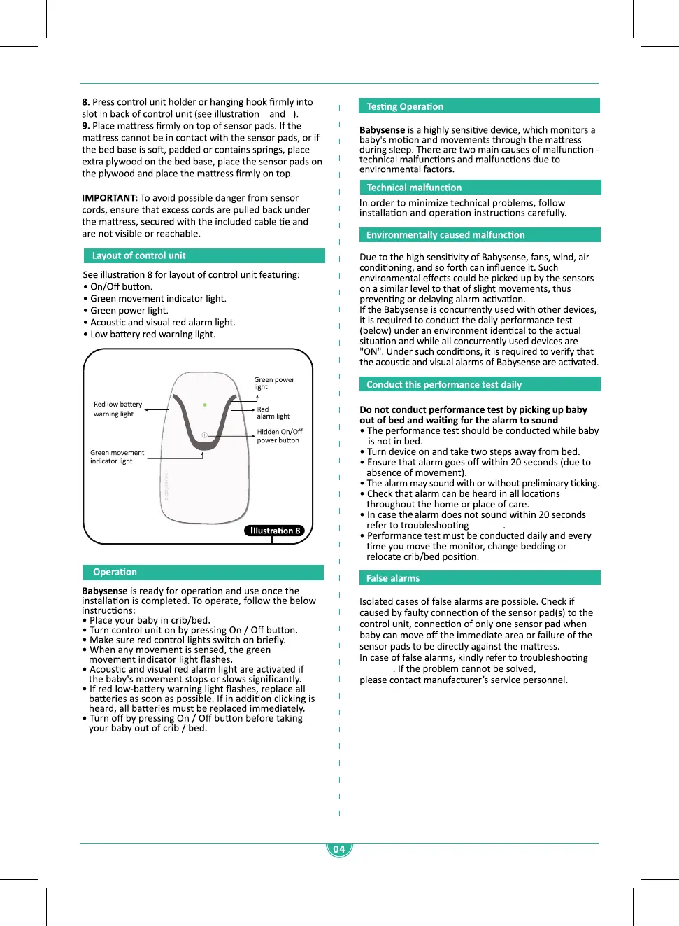 BabySense 7 - Testing Operation; Technical malfunction; Environmentally caused malfunction; Conduct this performance test daily