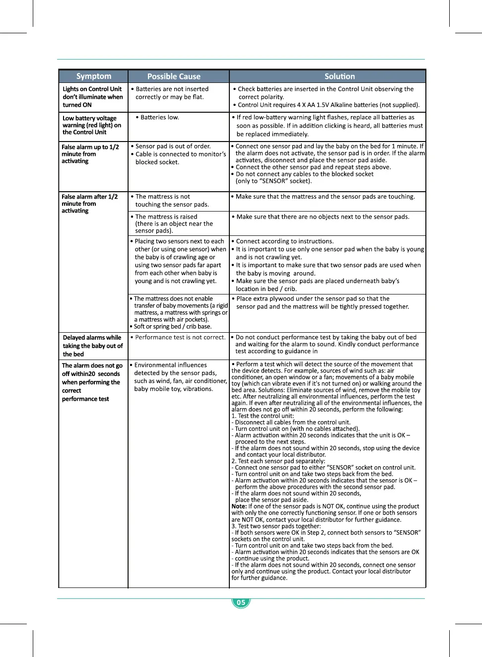 BabySense 7 - Troubleshooting Guide; Control Unit & Battery Issues; False Alarm Troubleshooting; Alarm Activation Issues