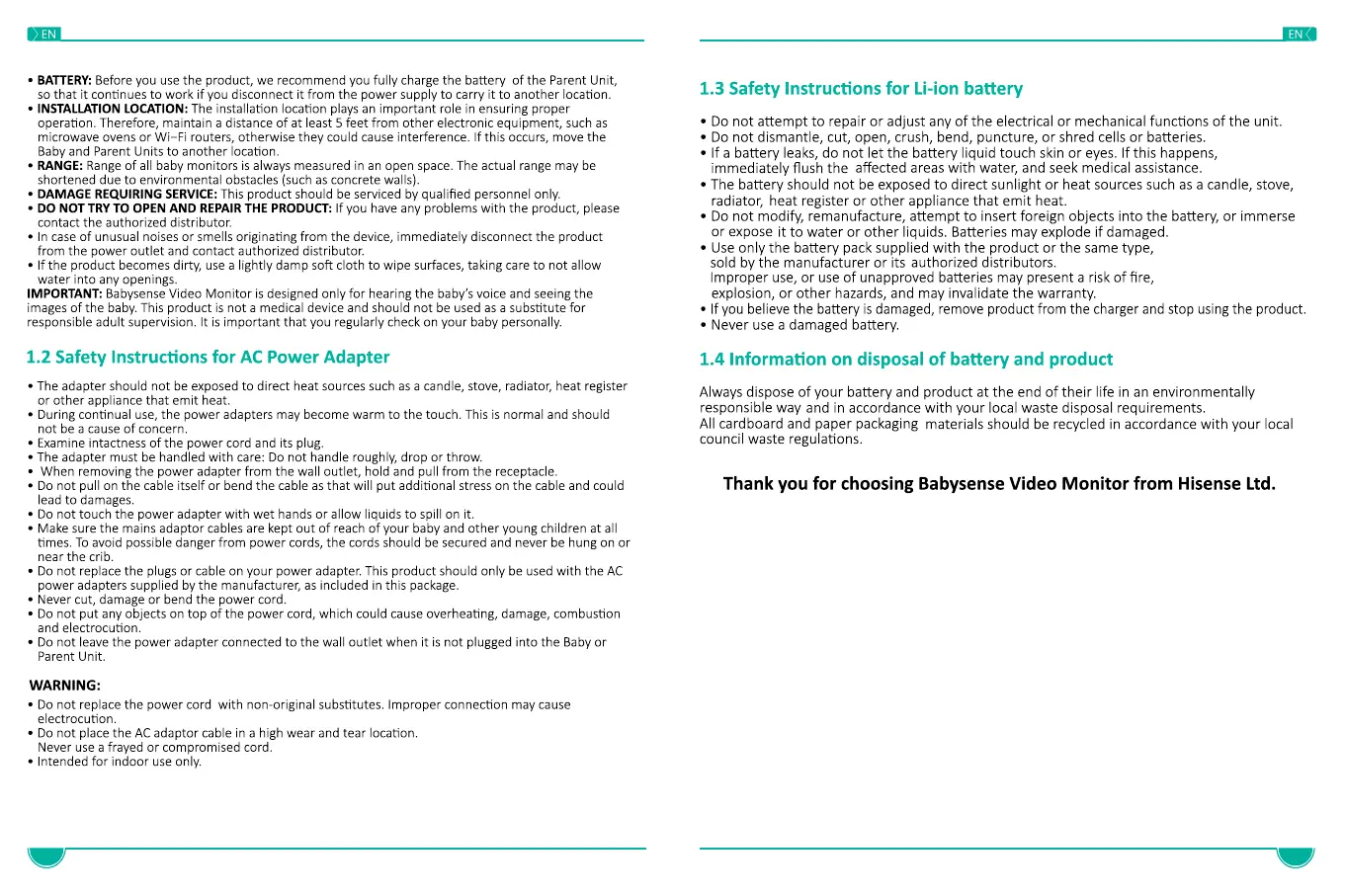 BabySense V43-1 - 1.2 Safety Instructions for AC Power Adapter; 1.3 Safety Instructions for Li-ion Battery; 1.4 Information on Disposal of Battery and Product