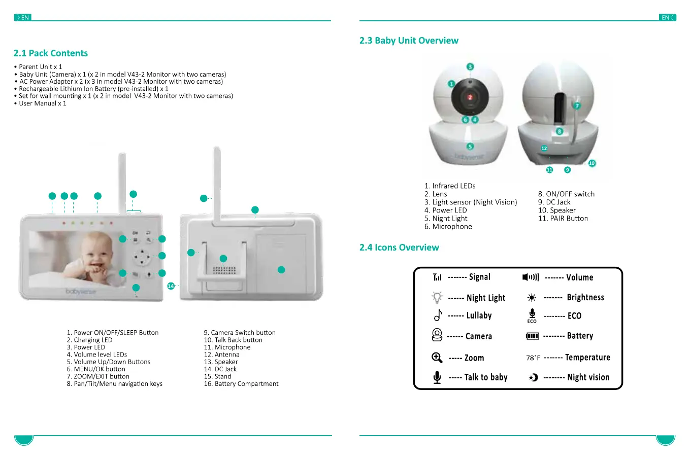 BabySense V43-1 - Product Overview; 2.1 Pack Contents; 2.2 Parent Unit Overview; 2.3 Baby Unit Overview