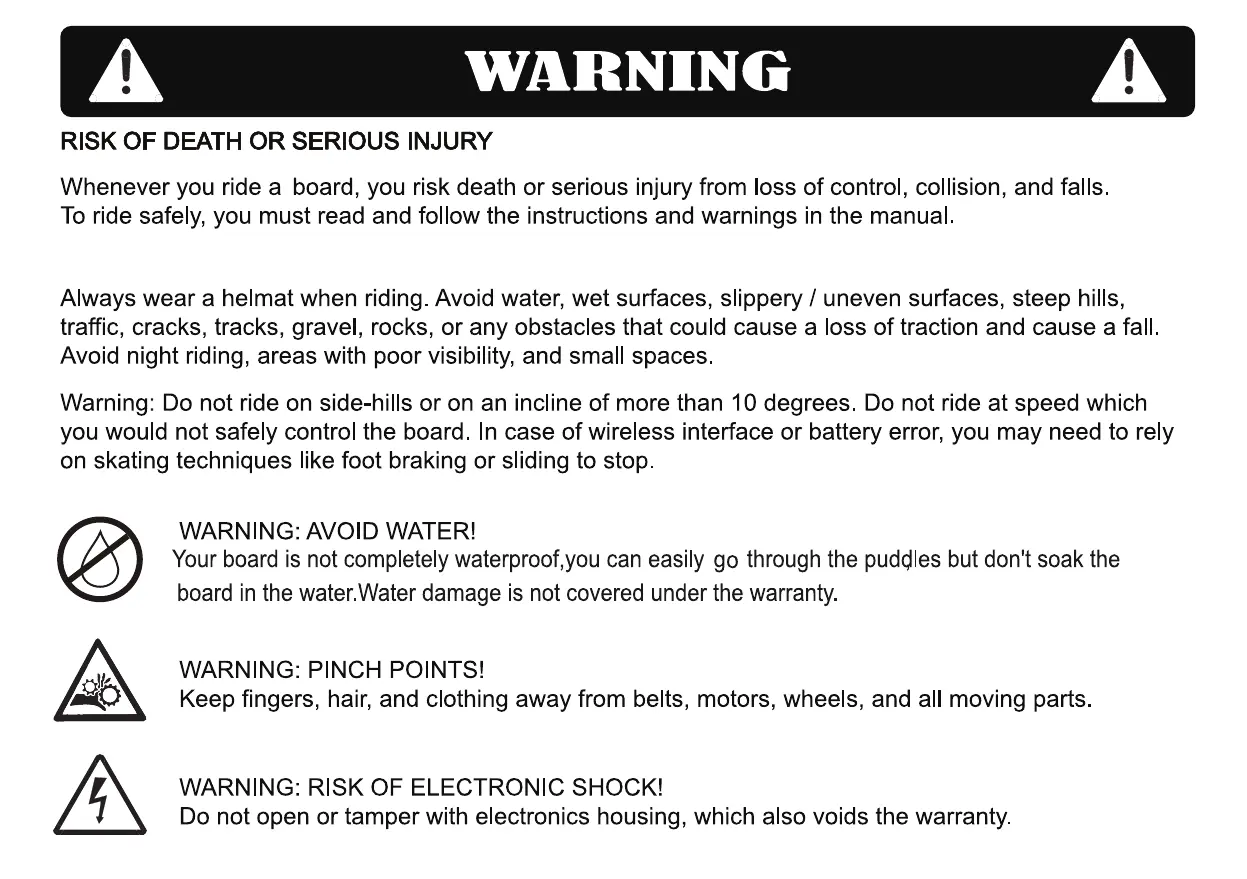 Backfire G3 - General Safety Warnings; Risk of Death or Serious Injury; Water Damage Caution; Pinch Point Hazard