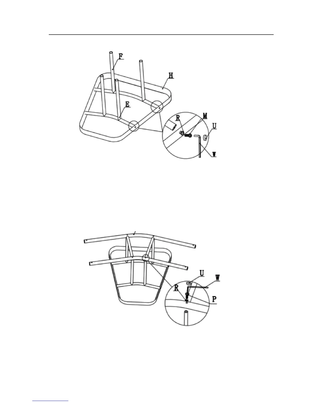 (E) and table top support bracket (large) (F) with M6*35 bolt (P) and steel washer (R) as shown