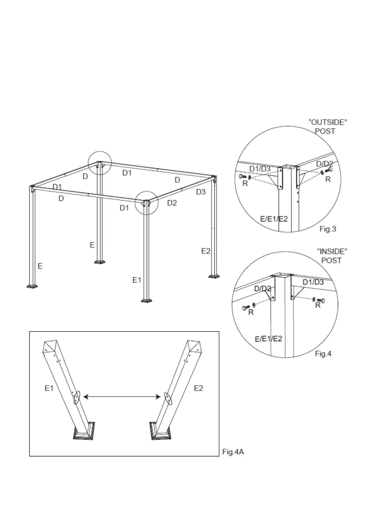 Step 3A: Attach Cross Beams (D/D1) to Corner Posts (E/E) using Bolt and Washer (R). Repeat for corner