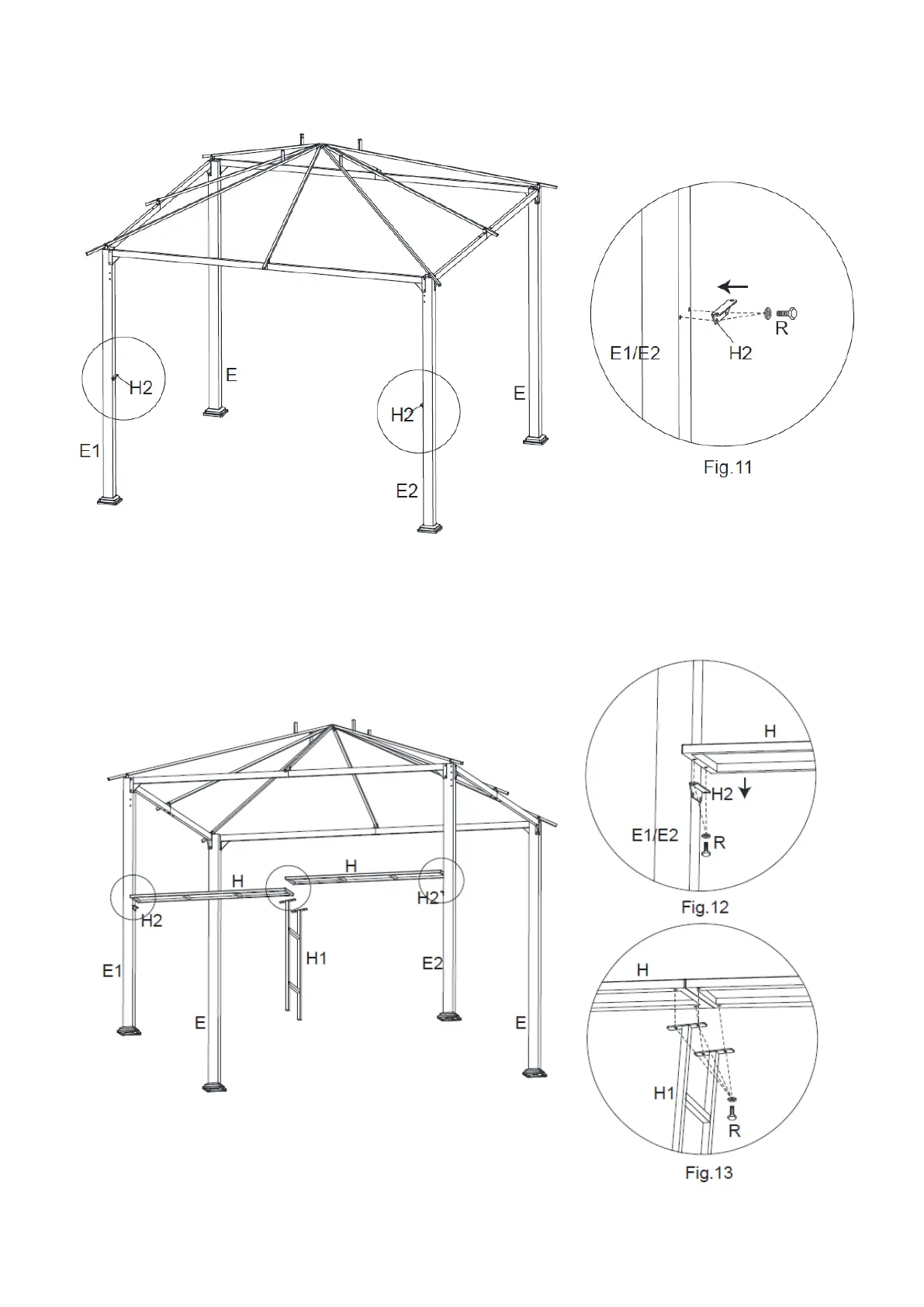 Step 7: Connect the Bar Connector (H2) to the Corner Post (E1/E2) and tighten with Bolt and Washer (R).